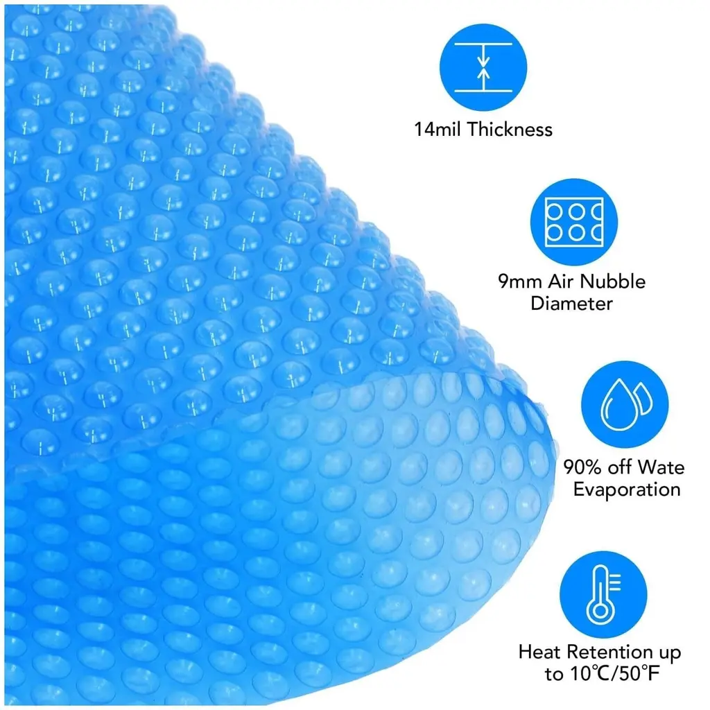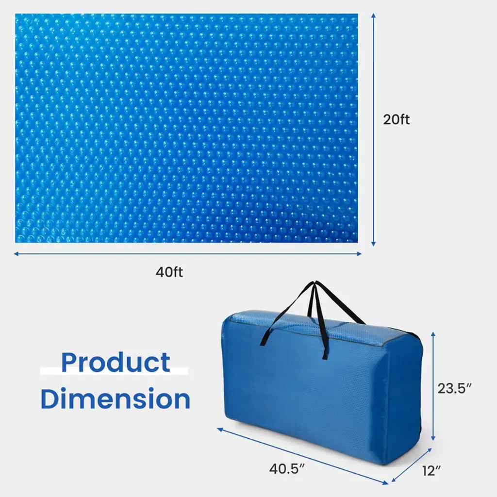 Using no fuel or electricity, this pool solar blanket offers you an effective and affordable solution to heat up your pool water and extend swimming season. And this pool solar reduces 95% of water evaporation. Moreover, this pool cover can also prevent leaves, dust and debris from accumulating in the water. Also, it can raise water temperature by up to 8-15℃/ 14-27℉in about 5-7 days of consistent sunlight(Please Note: The effect of heating is influenced by the environment). Besides, it’s easy to store and transport with the carrying bag. In addition, you can freely cut it into the shape you want to fit the shape your pool!FeaturesHeats up the pool water by utilizing solar energy Prevents the water temperature from dropping too much at night Keeps the water clean and reduces the evaporation Made of sturdy and thick PE material Easy to store and transport with the carrying bag Suitable for in-ground and above-ground swimming pools Can be cut into any shape you wantColor: Blue Material: PE Product Dimensions: 40 ft x 20 ft (L x W)\32 ft x 16 ft (L x W) \36 ft x 18 ft (L x W) Carrying Bag Dimensions: 40.5'' x 12'' x 23.5'' (L x W x H)\26.5'' x 13'' x 19'' (L x W x H)\39'' x 11'' x 22.5'' (L x W x H) Thickness: 12 MIL Net Weight: 47.5 lbs Package Includes: 1 x Swimming Pool Cover 1 x Carrying Bag 1 x Instruction