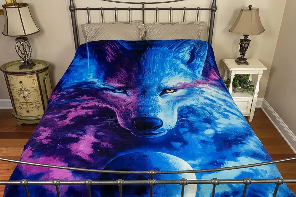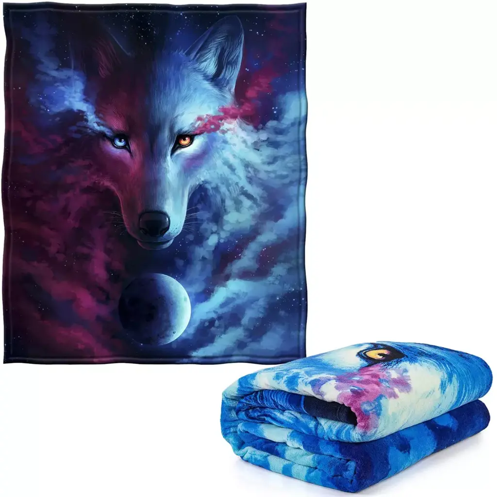 Dawhud Direct presents the Celestial Wolf Fleece Blanket. This luxurious and cozy blanket is made of 100% polyester and measures 50" x 60". It's exceptionally durable and machine washable, making it perfect for indoor and outdoor use. Printed with bright vibrant colors, this throw blanket will keep you warm all winter long and make a great holiday gift for the women, men and children. Snuggle up and keep warm with our eye catching Wolf design!