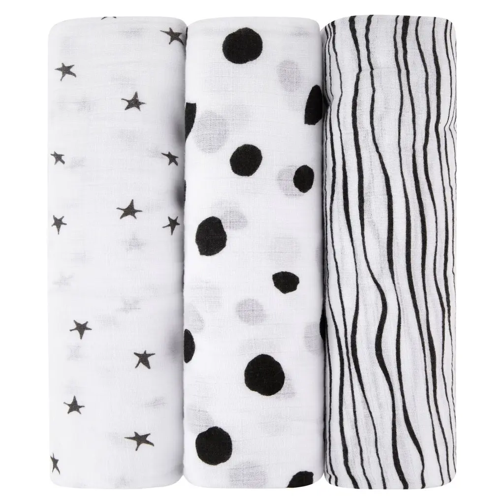 Ely's & Co. Cotton Muslin Swaddle Blanket 3-Pack composed of 100% Cotton Muslin Extra-Large Swaddle Blankets (47"x 47") 3 unique designs.This stylish swaddle blanket bundled in our gift-ready packaging makes it a perfect baby shower present for baby's. Swaddling creates a cozy and soothing, womb-like atmosphere to help infants sleep more sound by reducing the startle reflex. We make our muslin swaddle blankets from a single layer of material, composed of 100% cotton, which helps reduce the risk of overheating and promotes a longer night's sleep. Swaddling may soothe a crying baby and lead to a healthier night's sleep, making this set an essential item for your Baby Registry.Our versatile 47 x 47 (120 cm x 120 cm) cotton muslin swaddle can also function as your little ones playtime blanket, stroller, or car seat cover, changing pad cover, burp cloth, as well as mommys nursing cover. 100% Cotton Muslin Gentle on Babys Sensitive Skin Machine Washable Gets Softer with Each Wash!
