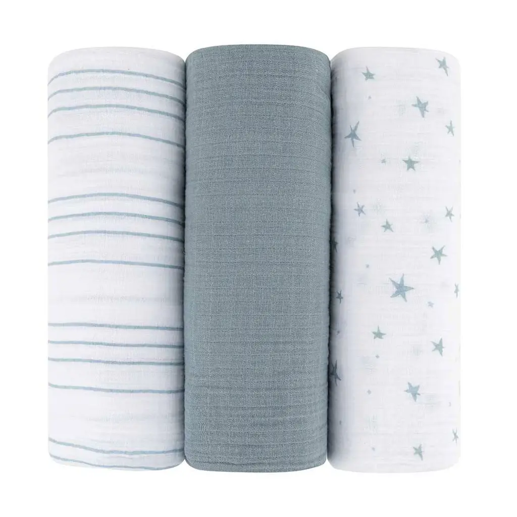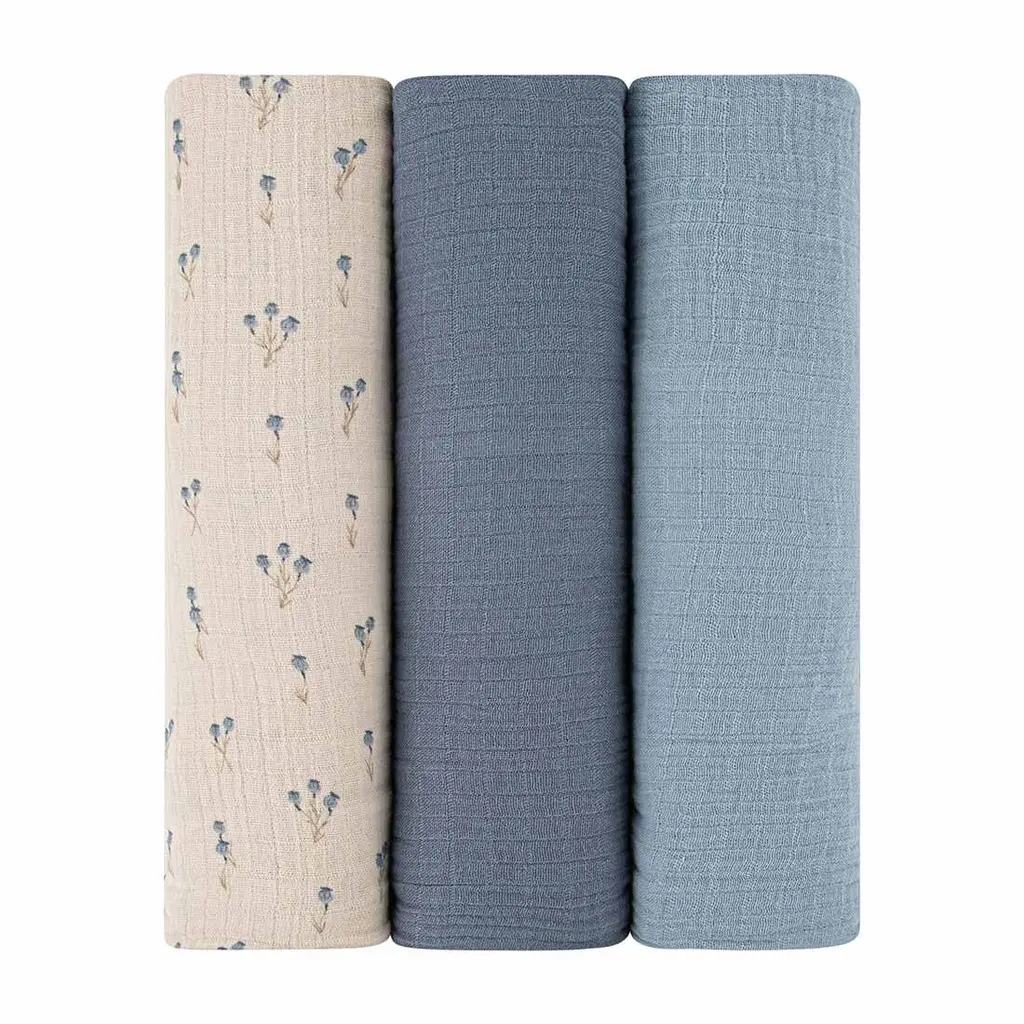 Ely's & Co. Cotton Muslin Swaddle Blanket 3-Pack composed of 100% Cotton Muslin Extra-Large Swaddle Blankets (47"x 47") 3 unique designs.This stylish swaddle blanket bundled in our gift-ready packaging makes it a perfect baby shower present for baby's. Swaddling creates a cozy and soothing, womb-like atmosphere to help infants sleep more sound by reducing the startle reflex. We make our muslin swaddle blankets from a single layer of material, composed of 100% cotton, which helps reduce the risk of overheating and promotes a longer night's sleep. Swaddling may soothe a crying baby and lead to a healthier night's sleep, making this set an essential item for your Baby Registry.Our versatile 47 x 47 (120 cm x 120 cm) cotton muslin swaddle can also function as your little ones playtime blanket, stroller, or car seat cover, changing pad cover, burp cloth, as well as mommys nursing cover. 100% Cotton Muslin Gentle on Babys Sensitive Skin Machine Washable Gets Softer with Each Wash!
