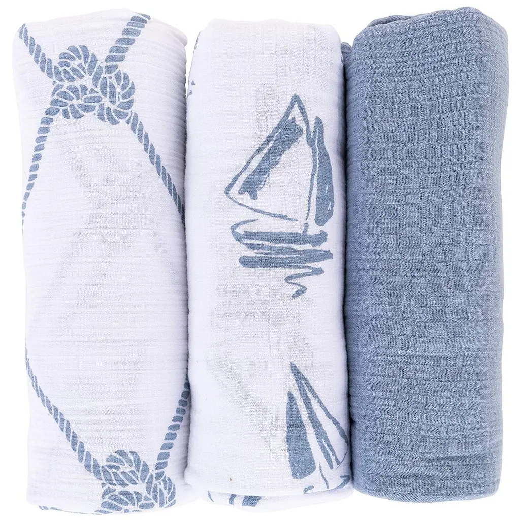 Ely's & Co. Cotton Muslin Swaddle Blanket - 3 Pack - 42"x42" - 0-24 Months - Nautical/solid Blue