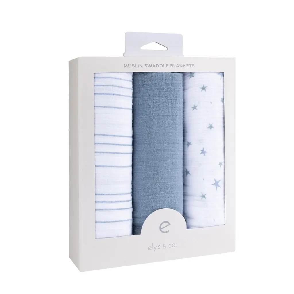 Ely's & Co. Cotton Muslin Swaddle Blanket 3-Pack composed of 100% Cotton Muslin Extra-Large Swaddle Blankets (47"x 47") 3 unique designs.This stylish swaddle blanket bundled in our gift-ready packaging makes it a perfect baby shower present for baby's. Swaddling creates a cozy and soothing, womb-like atmosphere to help infants sleep more sound by reducing the startle reflex. We make our muslin swaddle blankets from a single layer of material, composed of 100% cotton, which helps reduce the risk of overheating and promotes a longer night's sleep. Swaddling may soothe a crying baby and lead to a healthier night's sleep, making this set an essential item for your Baby Registry.Our versatile 47 x 47 (120 cm x 120 cm) cotton muslin swaddle can also function as your little ones playtime blanket, stroller, or car seat cover, changing pad cover, burp cloth, as well as mommys nursing cover. 100% Cotton Muslin Gentle on Babys Sensitive Skin Machine Washable Gets Softer with Each Wash!