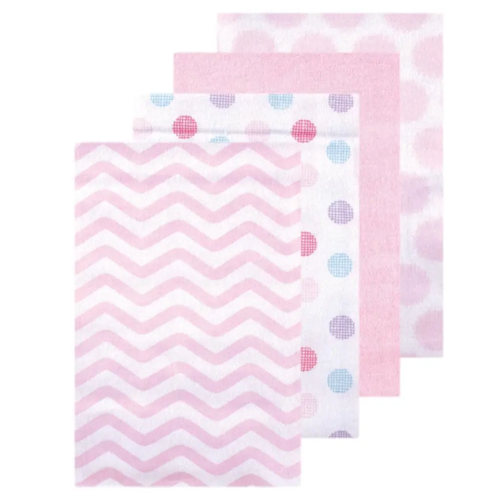 Wrap your infant within our adorable receiving blankets made of ultra-soft cotton flannel! Each is the perfect weight - not too lightweight, but not too thick, so great for swaddling, tummy time and cuddling!The purple swaddling and receiving blankets are adorned with cute prints and solids in beautiful shades of pinks! One is designed with flower bouquets, while another features hash marks! Two solid color blankets accent the prints perfectly!Each blanket measures 30” x 30” and is made with hardy, yet very soft cotton flannel, which retains its shape wash after wash! And with 4 receiving blankets in this essential baby layette set, you’ll have plenty between laundry days! With Everyday Kids, your children will always be comfortable and cute!