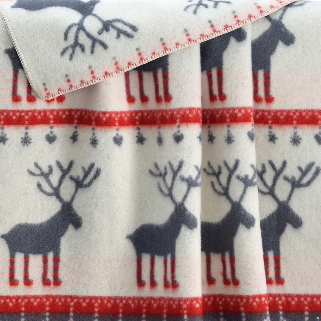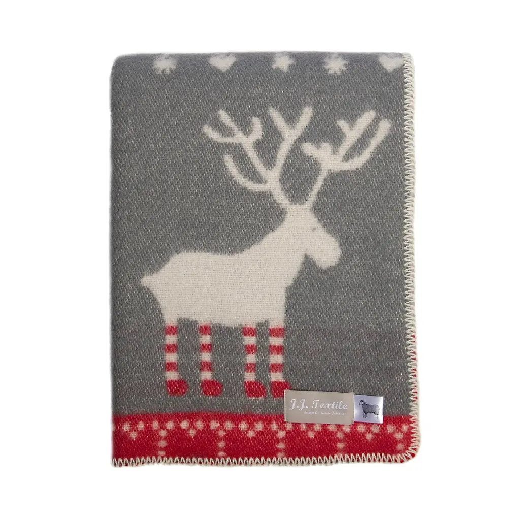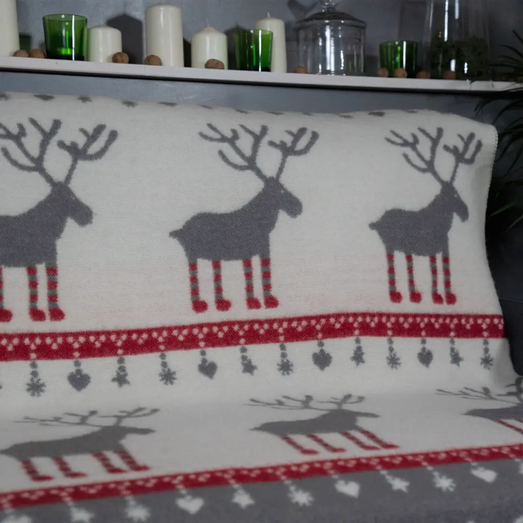 Get cosy this Christmas with our fabulous Festive Wool Blanket featuring sock-wearing reindeer. You can just imagine them all lined up ready to bring Christmas-cheer.Our wool blankets aren’t whispy little things - they’re chunky, weighty and woven to last. That lovely heft? It’s all thanks to their double structure. They’re thick enough to keep out the cold but still soft enough to snuggle into after a long day.