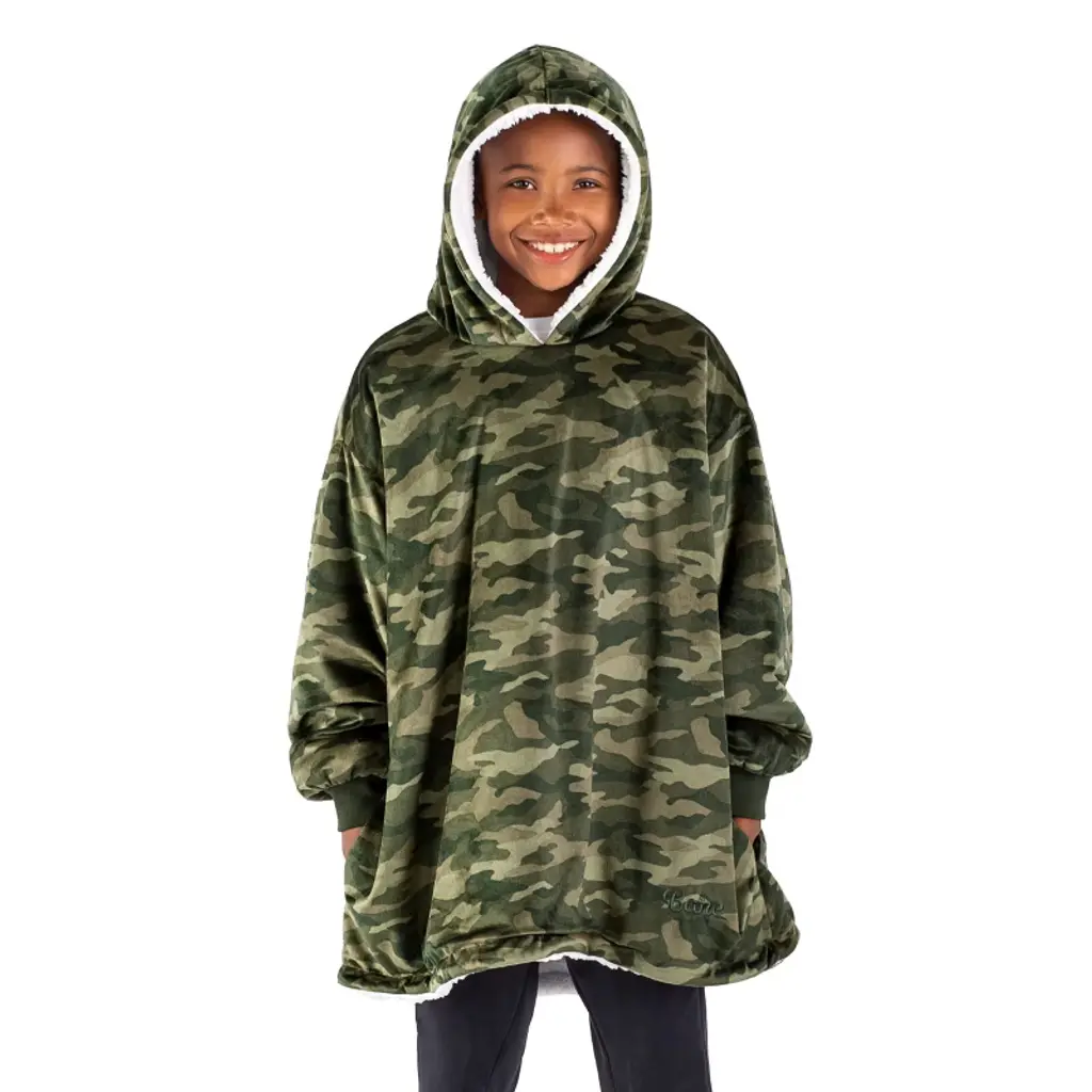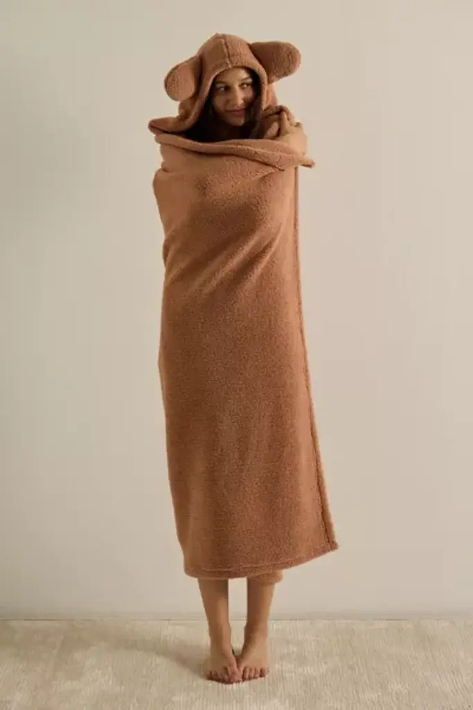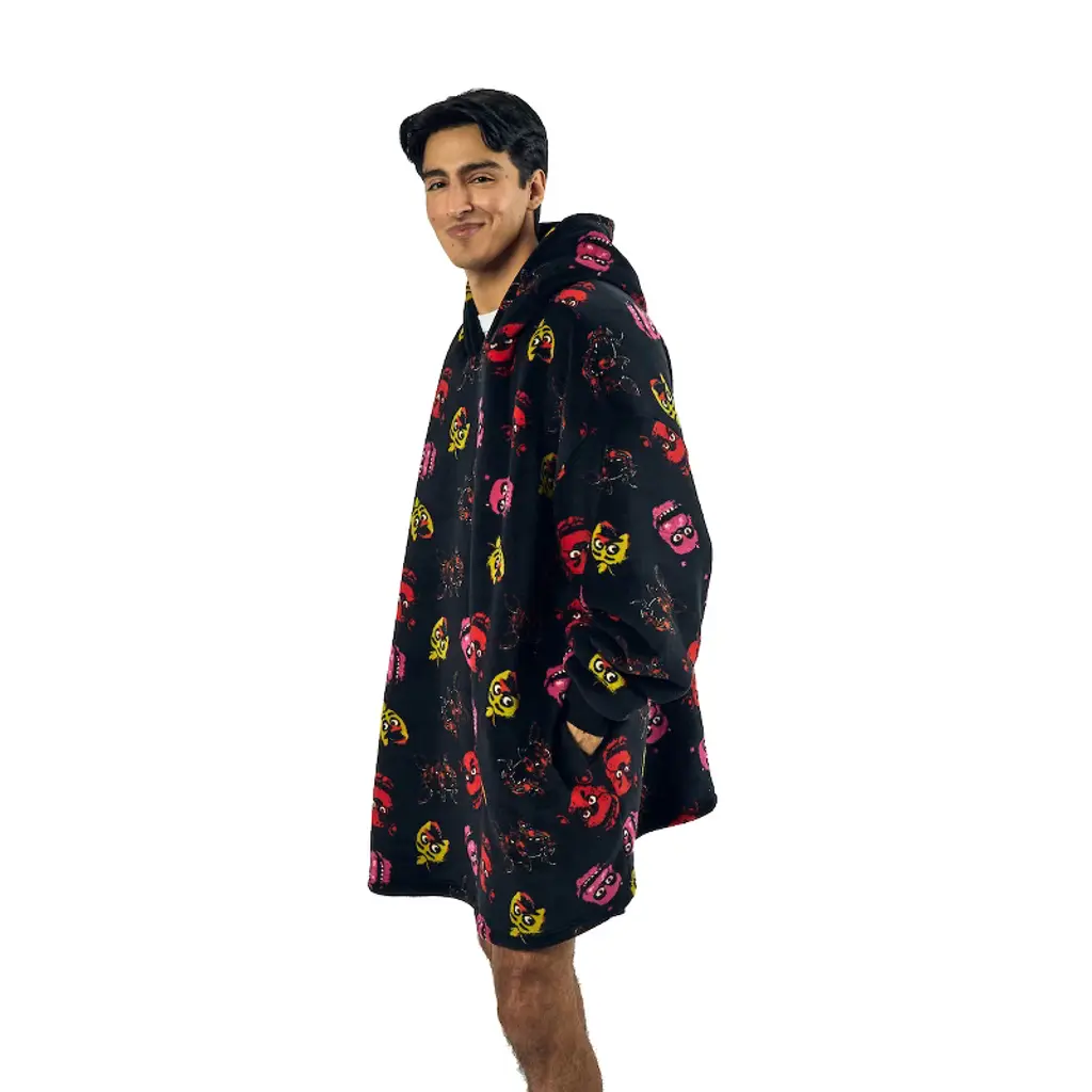 Dive into the world of Five Nights at Freddy's with this black hooded blanket, featuring an all-over print of neon character heads from the iconic animatronics. Crafted from cozy coral faux shearling back plush, it includes onseam pockets for added convenience. Measuring 36" in body length with a 35" bottom opening width, this blanket ensures both comfort and style. It's easy to care for. Just machine wash it on cold with like colors and tumble dry on low heat.