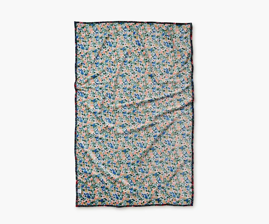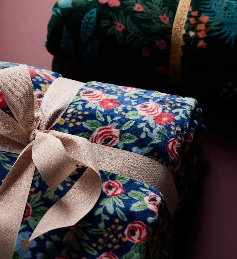 Curl up with a reversible fleece blanket featuring our Rosa floral print, a re-colored version of a design pulled from our archive. Made of plush fleece, the blanket comes packaged with a ribbon so it's ready to gift.