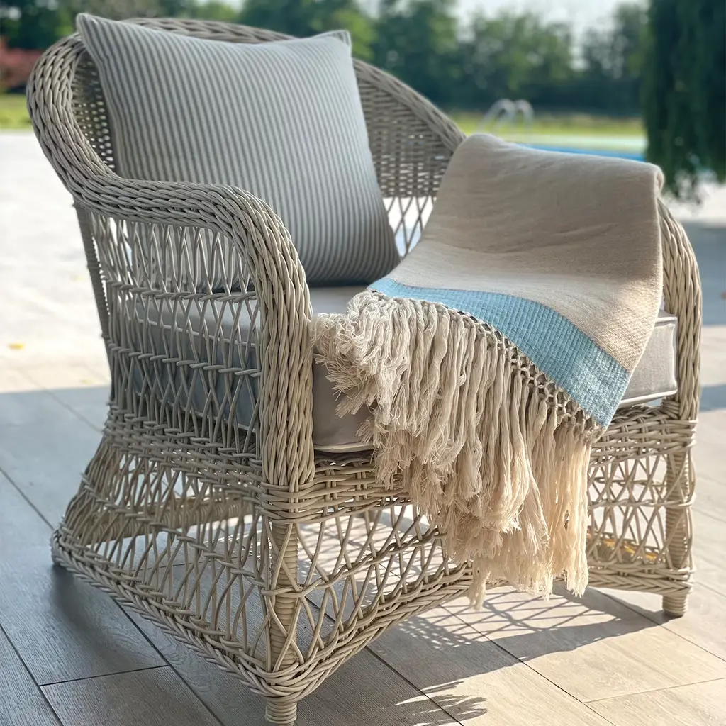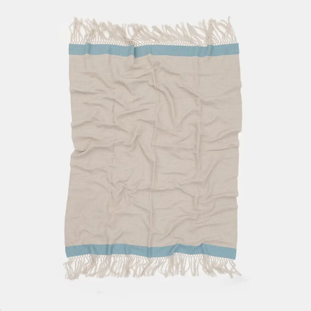 At once rigorous and fancy, this exclusive Merino wool blanket was conceived for maximizing coziness while not renouncing elegance. The light-blue-toned band running all along the 20cm-long hand-knotted fringed border adds a dash of freshness to the piece, softly interrupting its restrained monochromatic look. Different color options are available in the Artemest catalog.