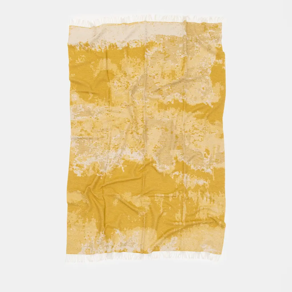 Striking in its rich mustard shades, this exclusive blanket flaunts an intriguing plaster-like motif sure to capture the eye. Monochromatic fringes adorn the borders, adding a dash of playfulness without overpowering the general pattern. Woven using 85% wool and 15% cashmere threads, it is also available in a pink-toned version.