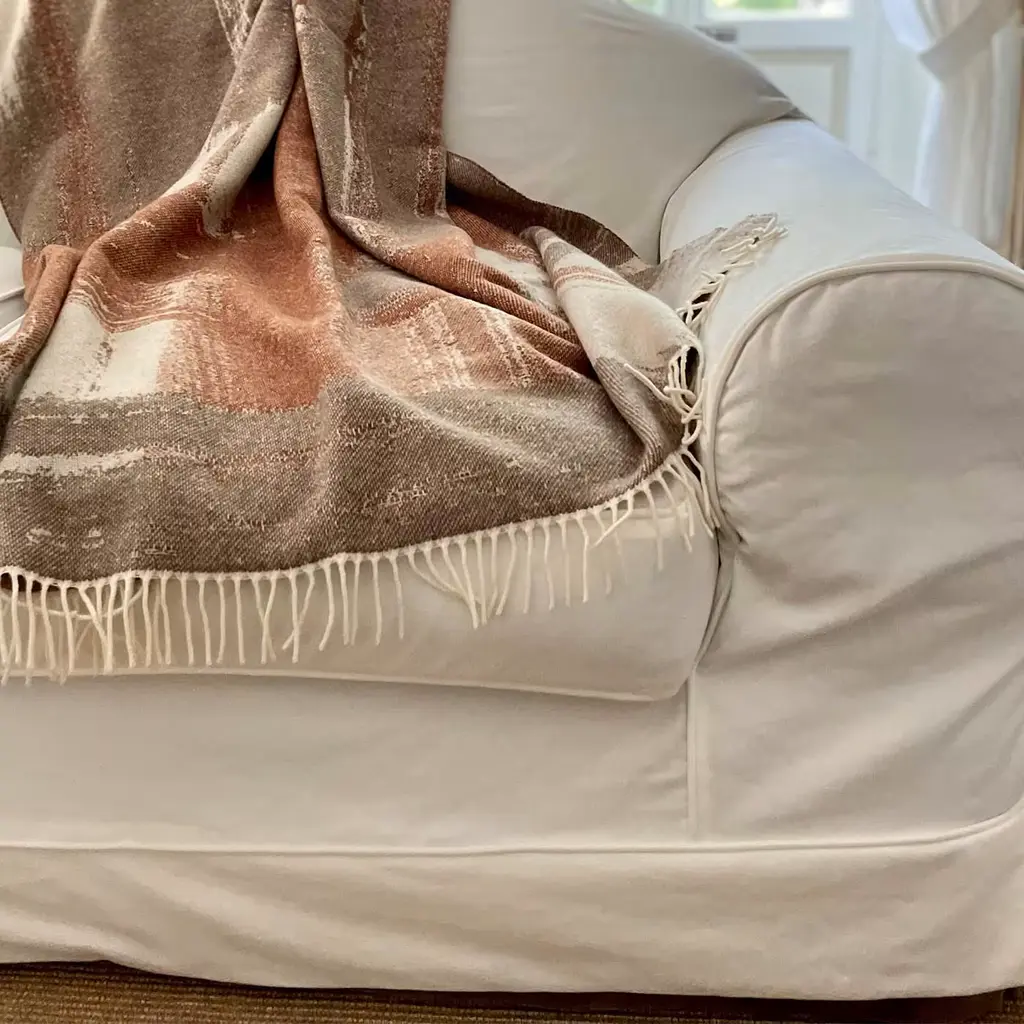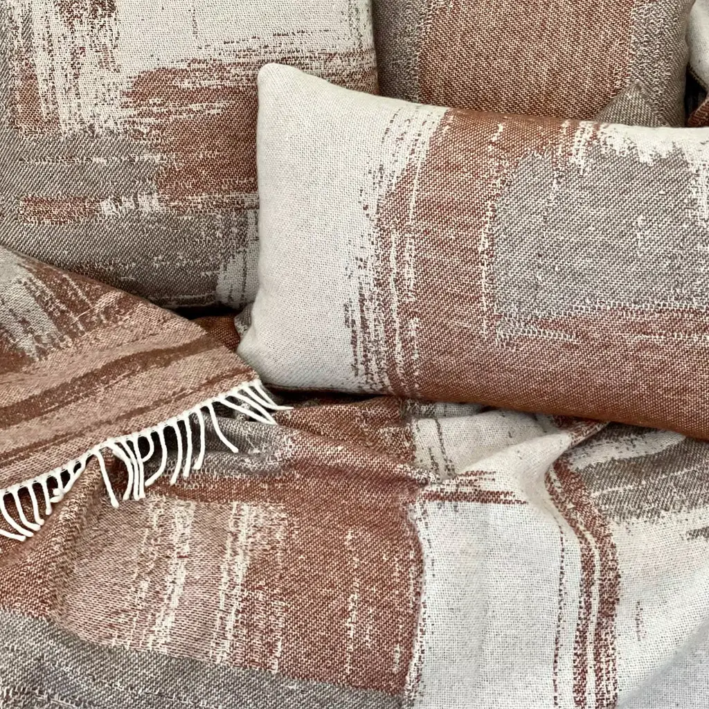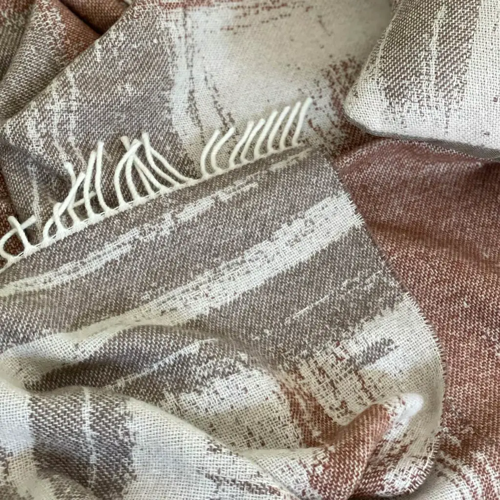 This elegant artisan blanket, hand-woven by Como artisans using a blend of 80% Merino wool and 20% cashmere sports a captivating, irregular pattern seemingly recreating brushstrokes. The clever selection of earthy tones for its weft favors its addition to a wide variety of palettes and styles. Completed by a fringe. Dry cleaning is highly recommended.