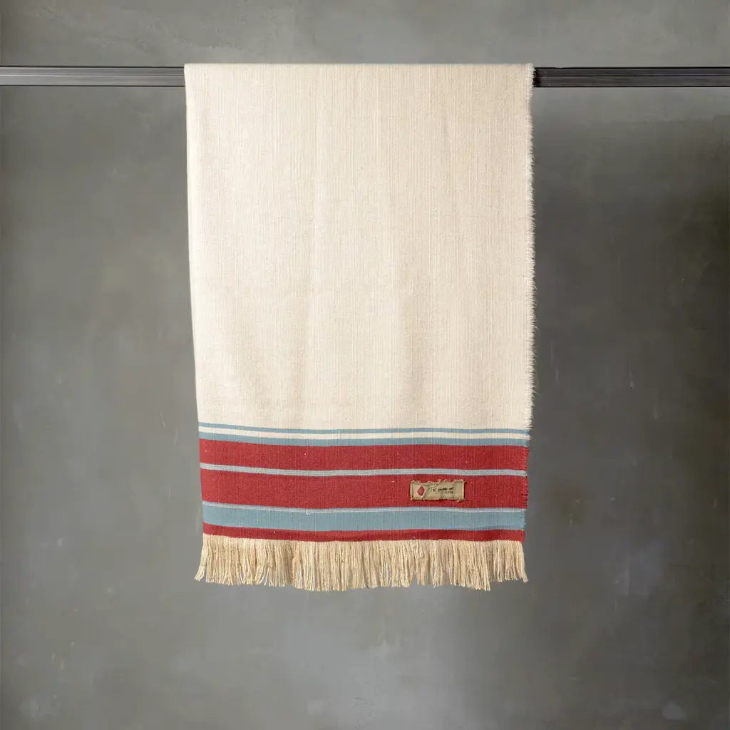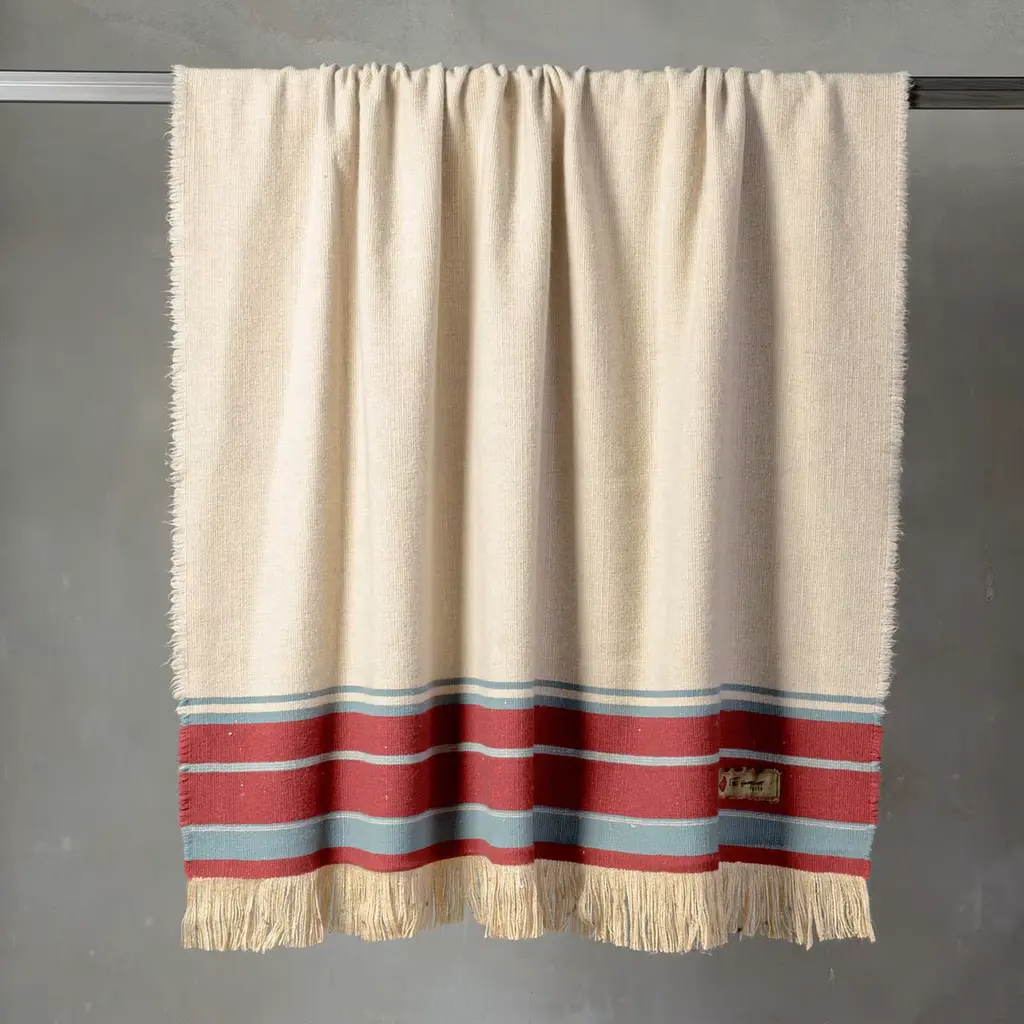 This sophisticated blanket, meticulously woven from fine silk and wool, surprises with the freshness and warmth of its tones, seemingly inspired by clear skies and ripe blood oranges. Fringed along the borders for a delicate statement of liveliness, the design results in a particularly bright appearance thanks to its chromatic prevalence of beige. More color options are available in the Artemest catalog.