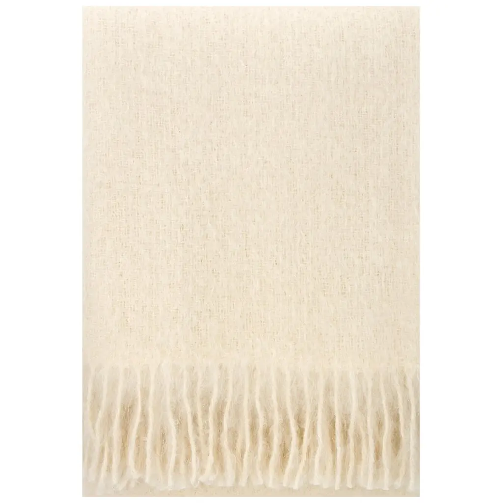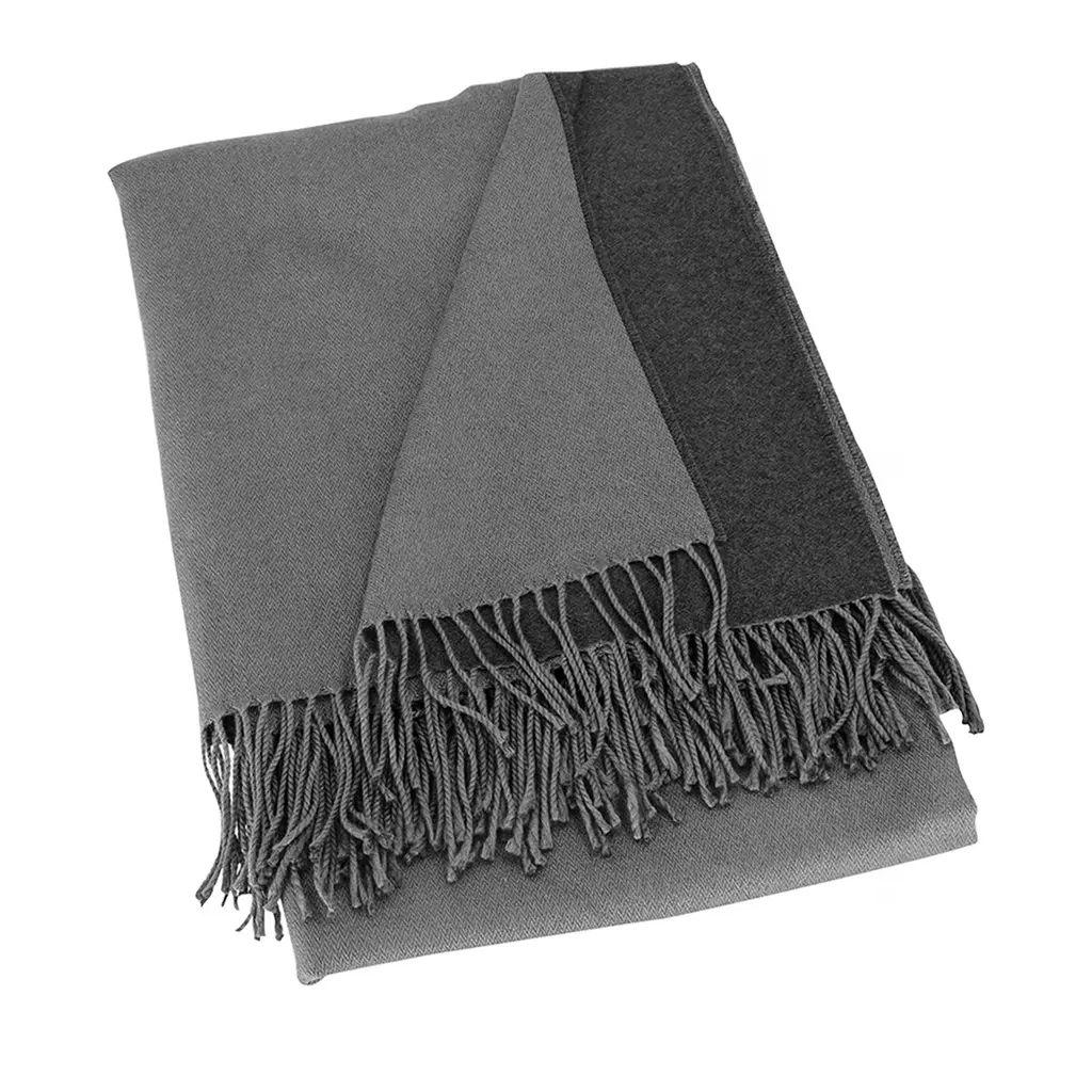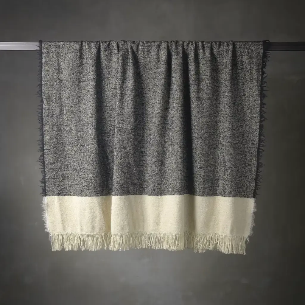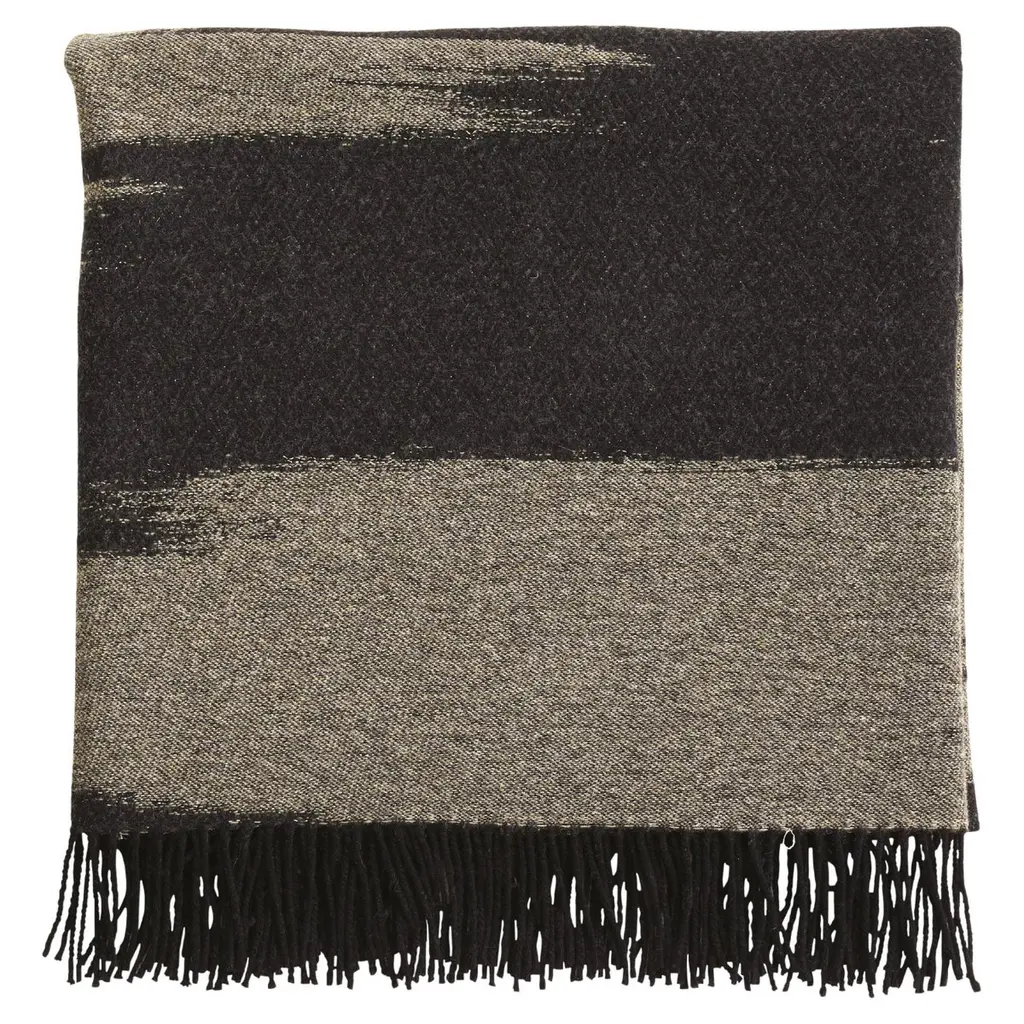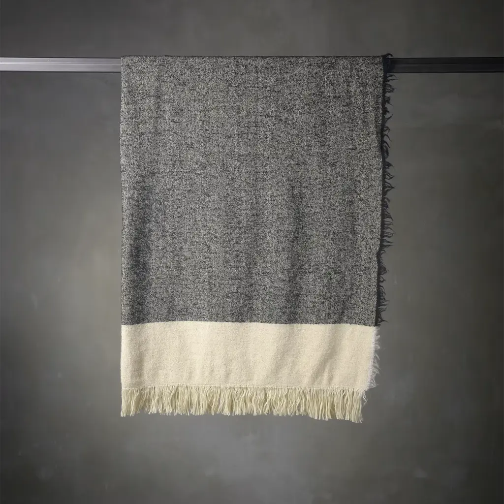 An ode to simplicity, the linear design marking this soft fringed blanket immediately speaks to its restrained elegance. Striking softness is owed to the blend of fine alpaca wool with linen and wool, yarns rigorously selected and minutely woven together for a weft of exceptional quality. The sober chromatic combination of dark gray and beige tones seals the blanket's unadorned class.