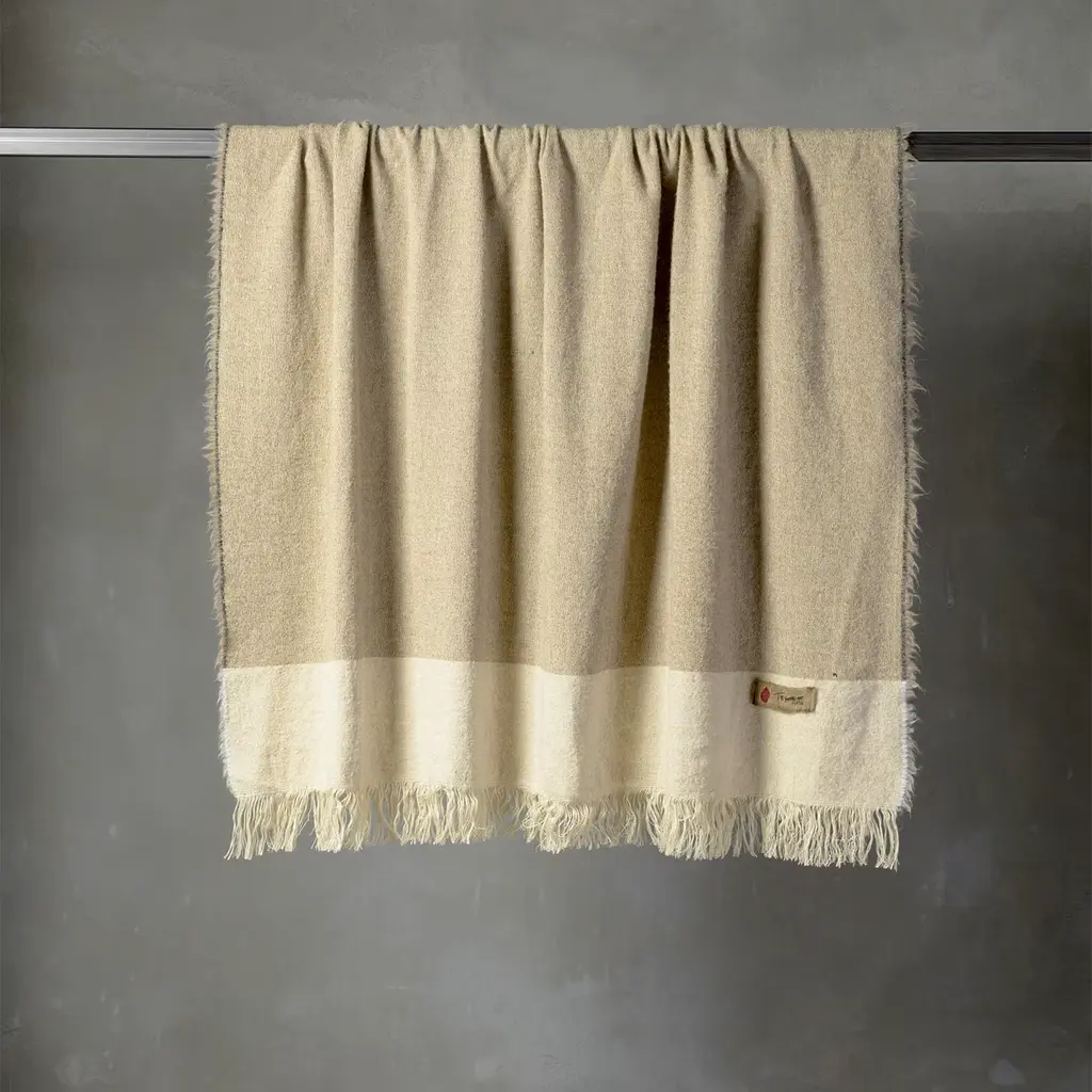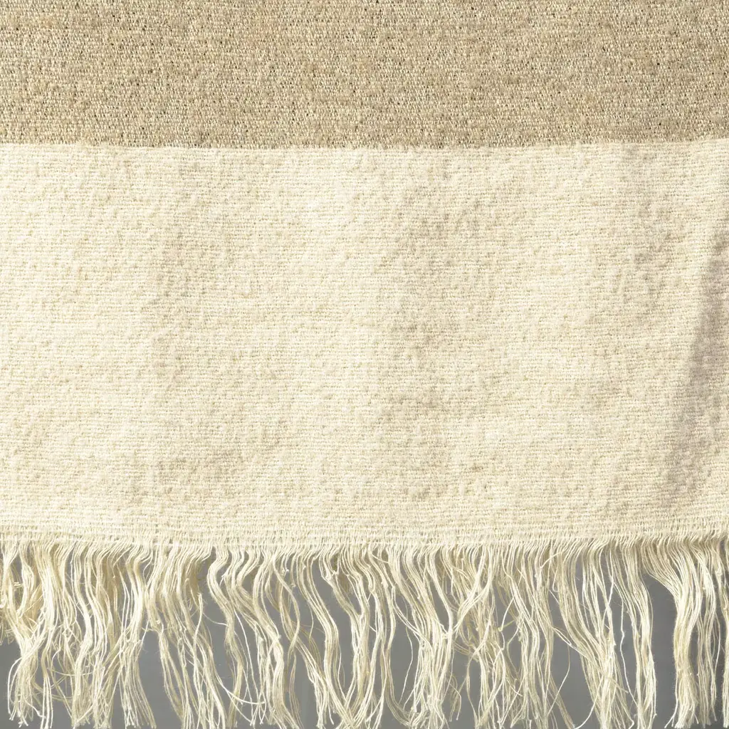 Ideal addition to neutral-toned decors, this extra-soft blanket woven from wool, linen, and alpaca wool was designed with timeless elegance in mind. Fringed borders only enliven its sober design, where a neat linear trait separates the sand-hued from the beige-hued areas, a chromatic statement unmistakably stating the blanket's quiet refinement.
