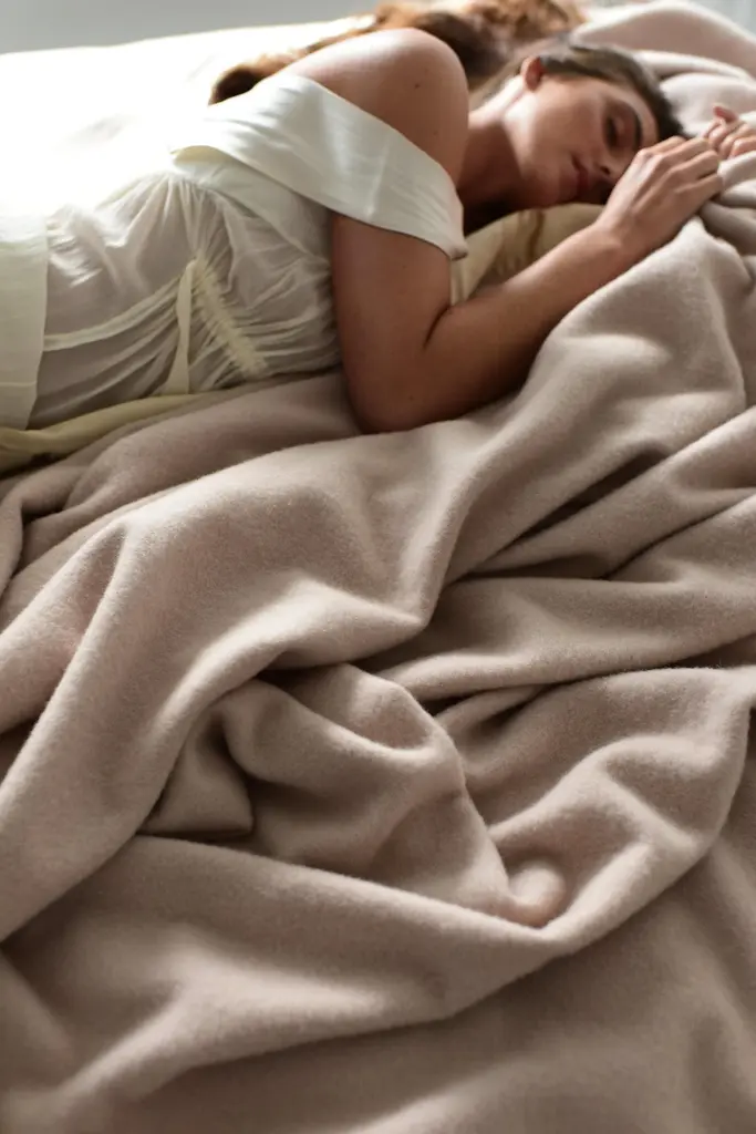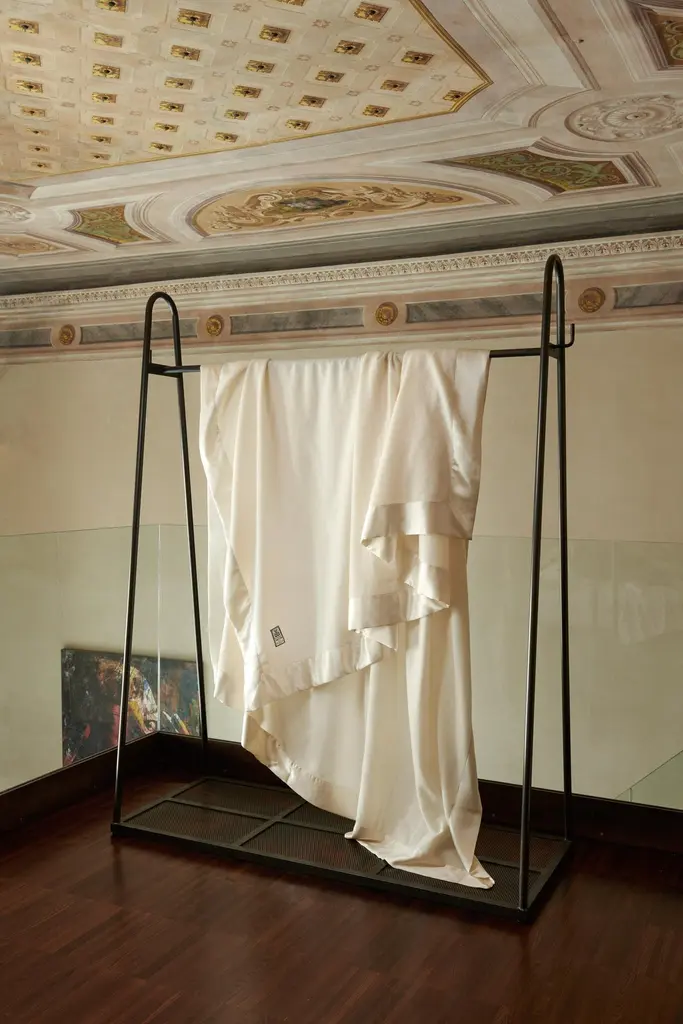 Can be used as a coverlet or blanket. Blankets as artful heirlooms. 18th century English mill wool carries Royal Warrant to Windsor Castle and is highest quality and softest Merino wool available. Available in other bespoke dye colors. 100% softest premium Australian Merino wool is framed top and bottom with JG Switzer signature, 4” silk border. 19 mm, weighty, pure silk charmeuse. Artfully designed exclusive to JG Switzer. Hand sewn in our design workshop. In white, raven black or bark also.Only 100% natural, nature's finest fibers.