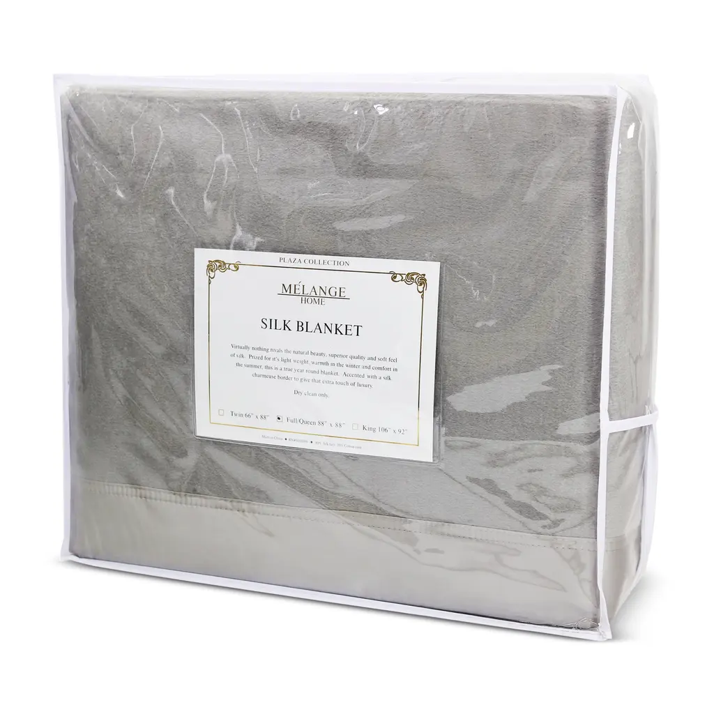 Wrap yourself in the luxurious, lightweight comfort of Melange's silk blanket, cast in a versatile array of tones and finished with sleek silk charmeuse border. DIMENSIONS: Twin: X"L x X"W; Queen: X"L x X"W; King: X"L x X"W DIMENSIONS: Twin: 66"L x 88"W; Full/Queen: 88"L x 88"W; King: 92"L x 106"W