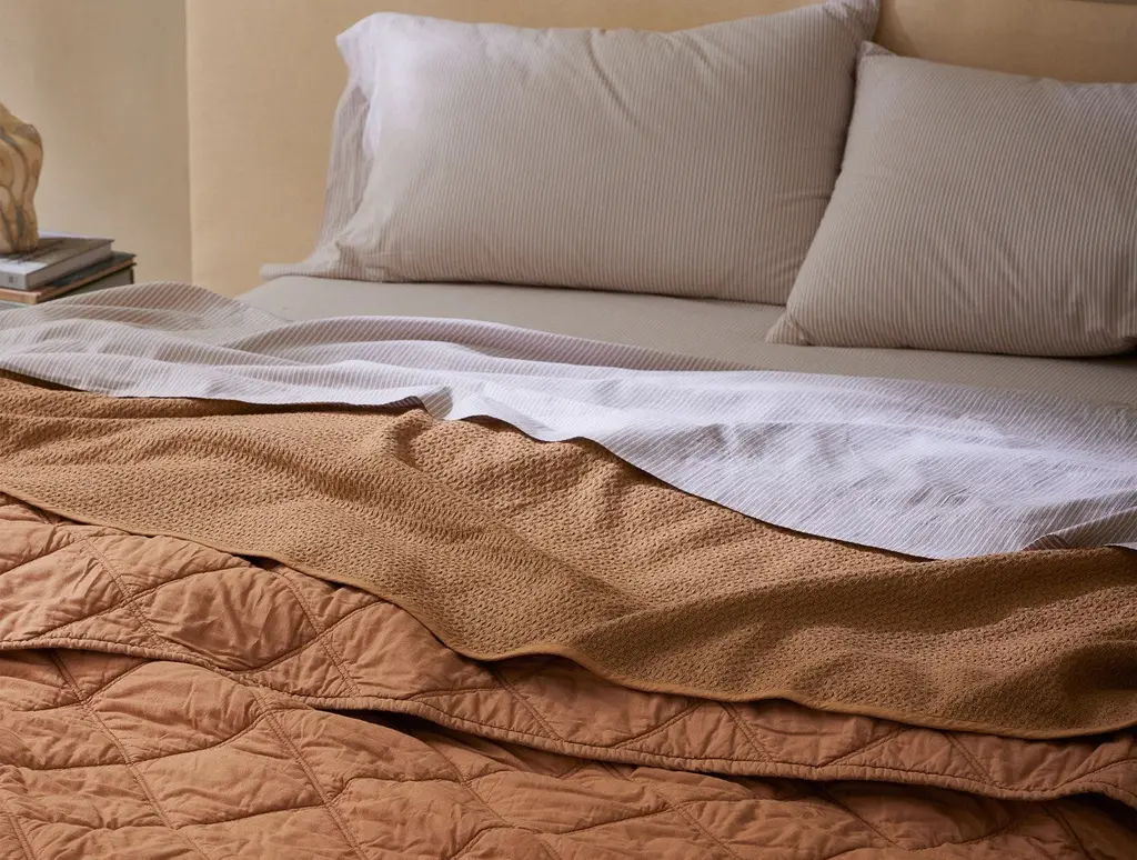 At home in any environment, this versatile layer is tightly woven into a textured jacquard that enhances the pure performance of organic cotton. The feel is soft and weighty, with rounded edges trimmed in color-matched percale fabric. Each blanket is pre-shrunk to retain its shape, year after year and wash after wash.