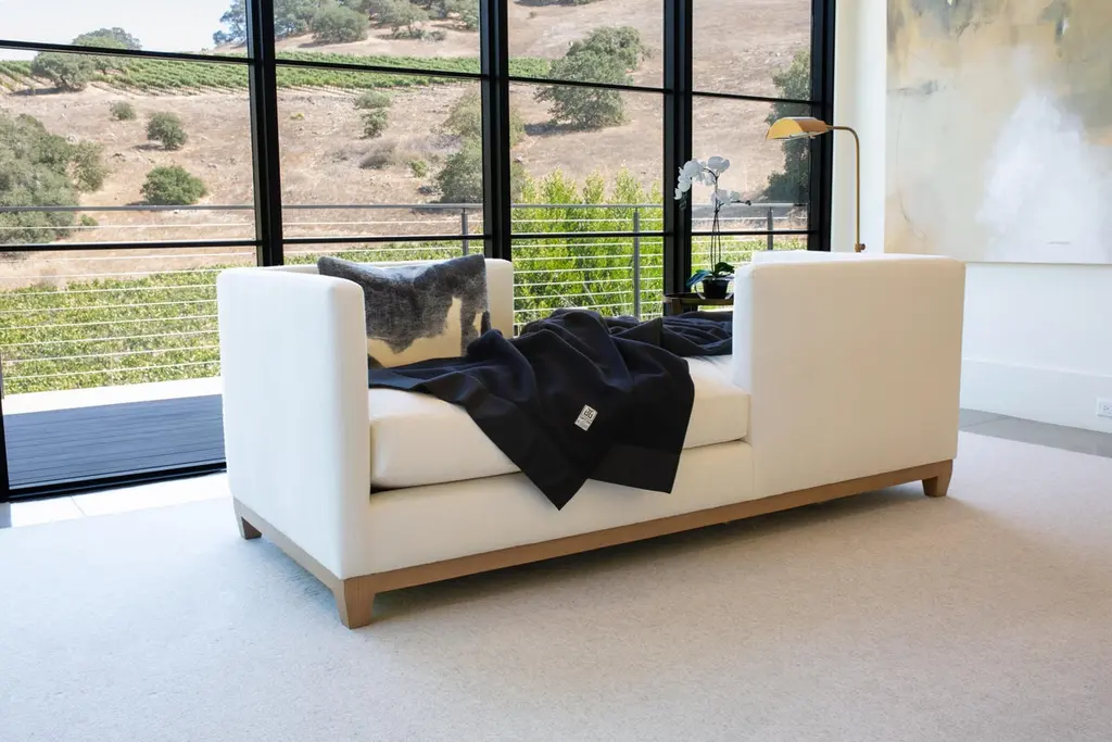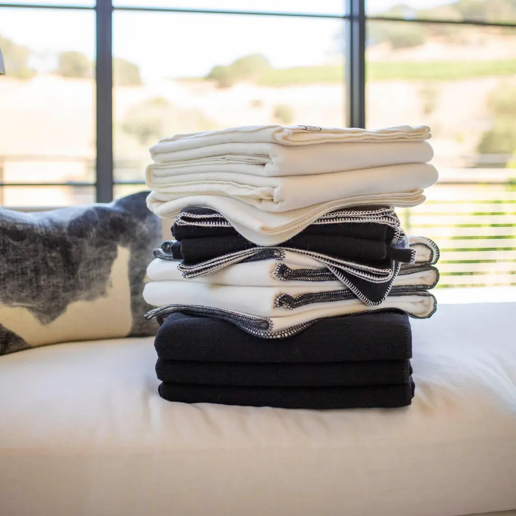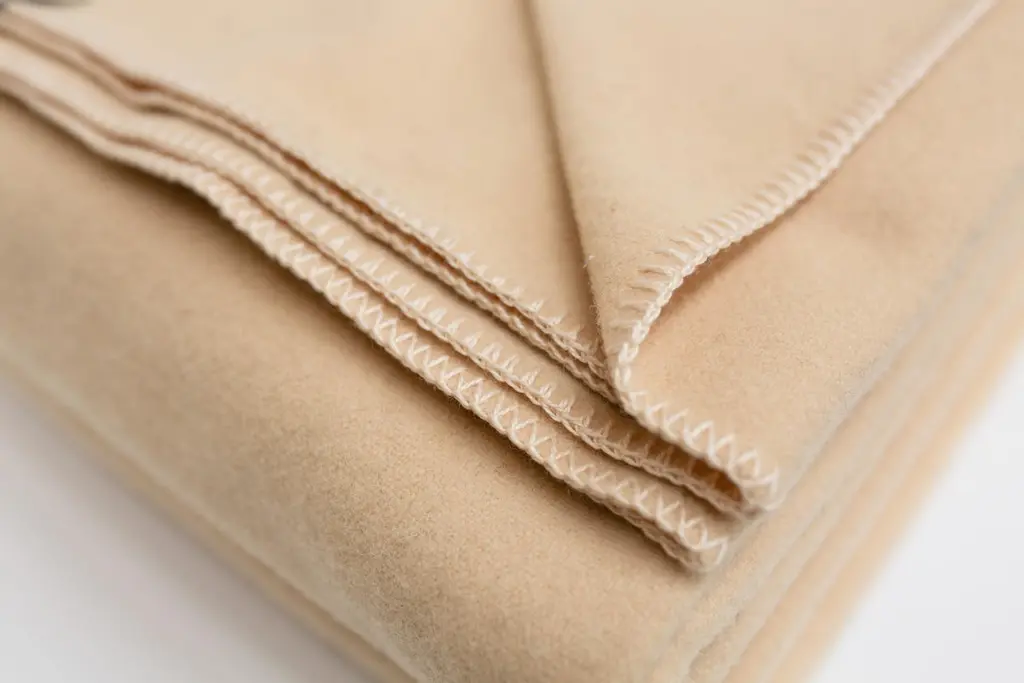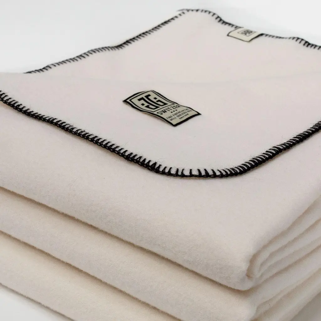 The Classic blanket in Sunshine Yellow is a tailored blanket exclusively made by JG SWITZER in 100% Merino Wool. Blanket stitch is done in house at our workshop in a lovely cream color. Milled in England from soft and high-quality Merino wool in an exclusive straw-color and sewn in California by JG SWITZER. You won't find a finer, more cheerful merino wool blanket. Designed to last many generations, this is an excellent wedding, anniversary or heirloom gift. Fabric: 100% Merino wool 400 GSM - warmth and weight.Stitch: The blanket stitch detail is our cream colored Alpaca and Silk yarn.Dimensions: Queen 90"x100", King 100" x110" will drape most beds with 10-12" drape on either side of the bed. Allow for 1" variance as we "sew as we go" and these are not factory manufactured. These blankets are generously sized to drape or tuck. Made in California.Care: wool cycle and wool dry or delicates/low-Temperature wash and Damp Dry/Delicates. Or dry clean. Complimentary Monogramming Available. Add desired text, font choice, & thread color to Special Instructions box in Cart. Colors and Fonts are limited to certain options and are non-refundable.