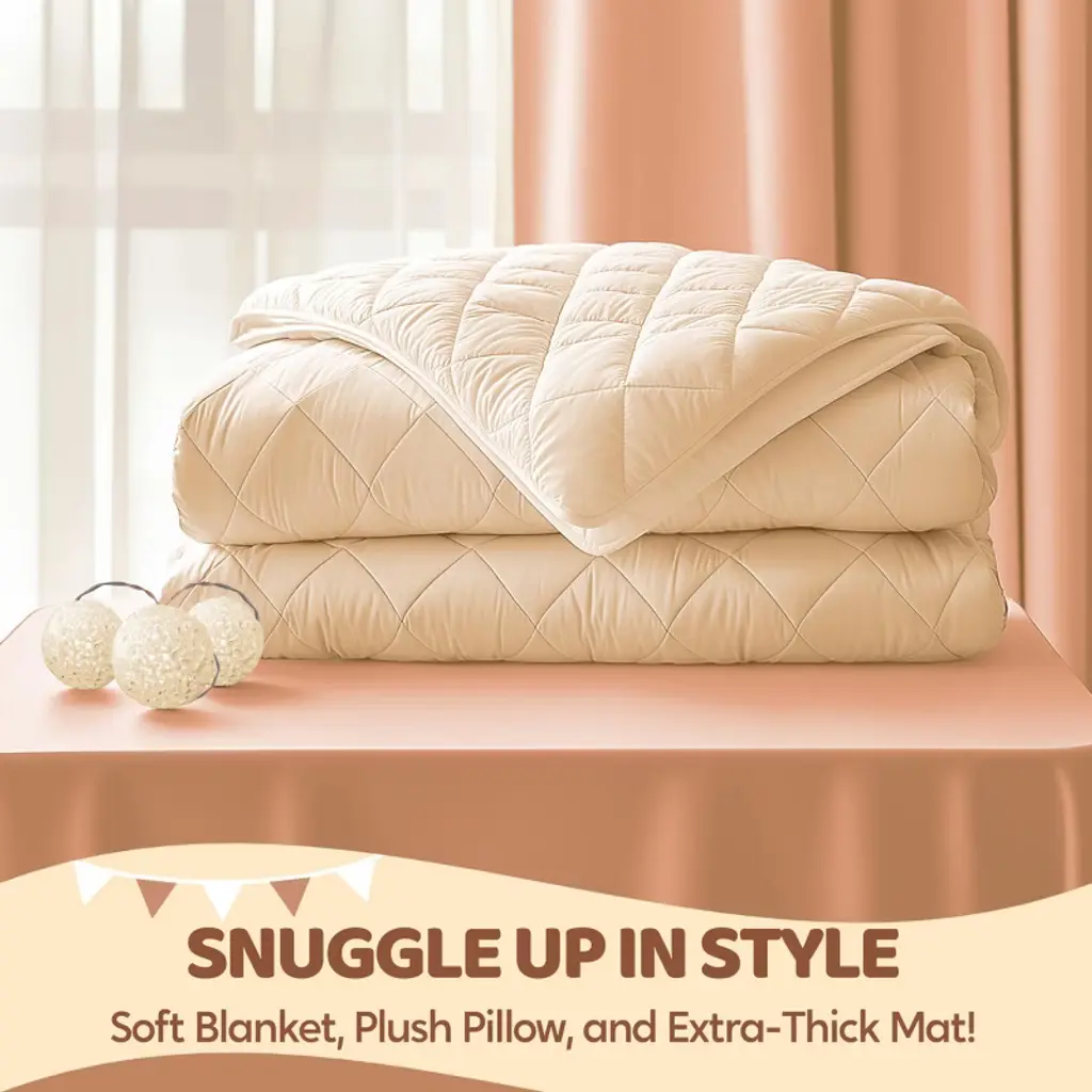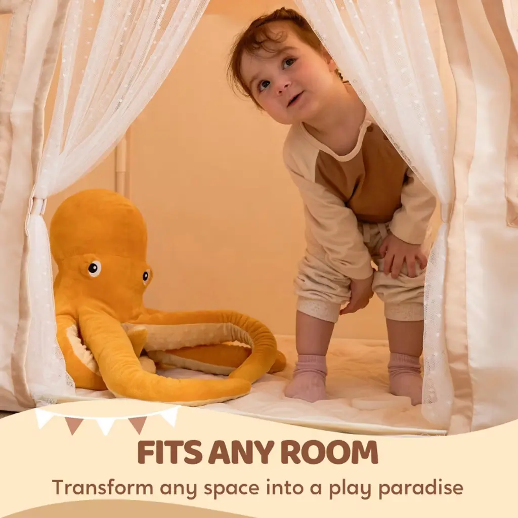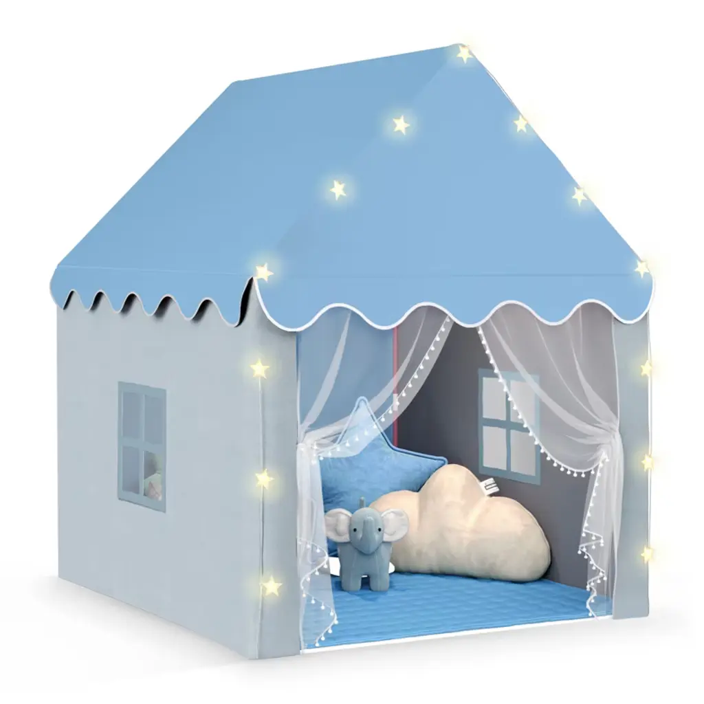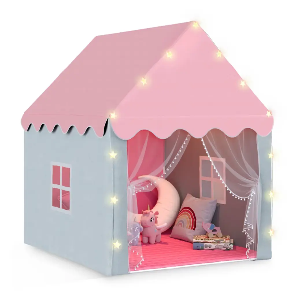 Joyfy large play tent measures 51 inches long, 35 inches wide, and 52.4 inches high, providing ample space for a cozy reading nook, a private cave, or fun sleepovers. It comfortably fits a mattress and accommodates up to three children for imaginative role-playing adventures, making it a must-have in kids' playroom furniture or toy collections. Easy to assemble—no tools required! Simply press firmly to secure the poles and ensure a snug fit for the fabric cover. Whether indoors, in the backyard, or at the park, setup is a breeze, transforming any space into a happy realm for your child. It includes a blanket, decorative flags, and beautiful lights to create a cozy, private retreat. A convenient storage bag is also included for easy organization and portability. The tent is made from high-quality polyester, ensuring long-lasting use while maintaining safety and stability for endless imaginative adventures. Whether for Christmas, birthdays, or any special occasion, it provides a delightful space for creative play, enhancing any collection of kids' indoor play equipment.
