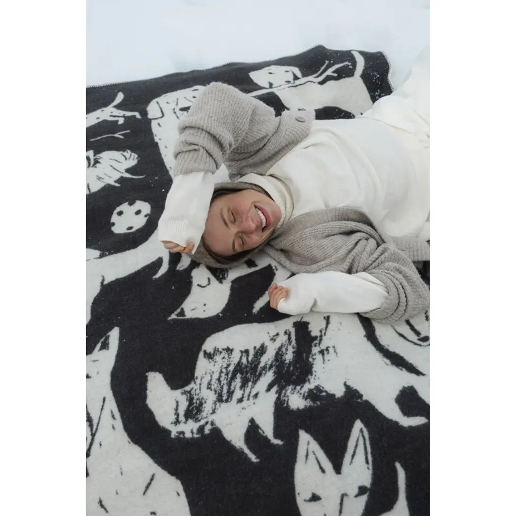 The Koirapuisto blanket by Lapuan Kankurit is adorned with a joyful pack of dogs drawn by Finnish illustrator Matti Pikkujämsä. Koirapuisto is Finnish for ”dog park”. This small blanket is perfect for children, and why not for your four-legged friends as well. The two-tone color palette gives the blanket a graphic look, with the pattern reversed on the other side. This soft, warm blanket is made in Finland from mulesing-free New Zealand wool.