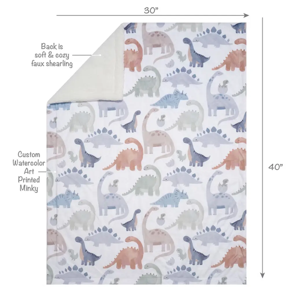 This warm and cozy blanket has an ultra-soft minky front and a luxurious faux-shearling back. The watercolor style blanket features many dinosaur species in multiple colors. It is perfectly sized at 30 inches by 40 inches making it great for moms, dads, and babies on the go. It also works great over car seats and strollers.