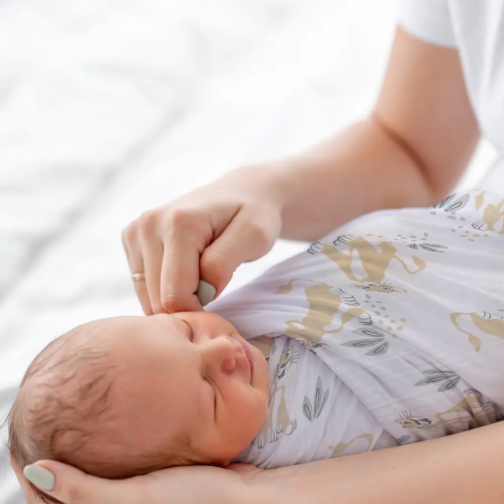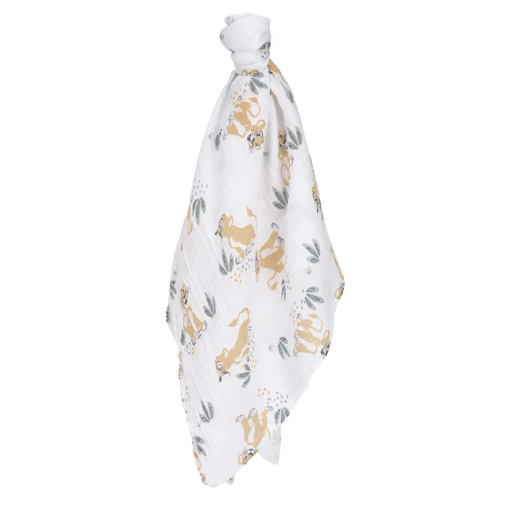 Wrap your little one in total comfort with this white, tan, green, and gray breathable 100% cotton muslin swaddle blanket. It features Lion King along with various plants and leaves on a soft white ground. This set also includes a cute little Lion King plush made in a soft velour. He is approximately 4 ½” tall. His face is embroidered making him baby safe. This set makes a great baby shower gift or welcome home baby gift. Main Color(s): White. Theme(s): Animals, Disney. Animal(s): Lion.