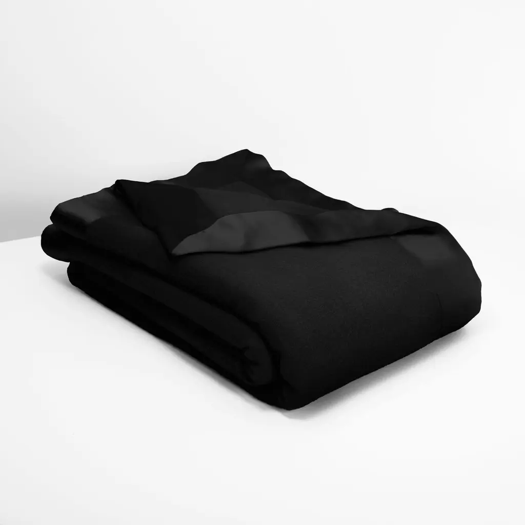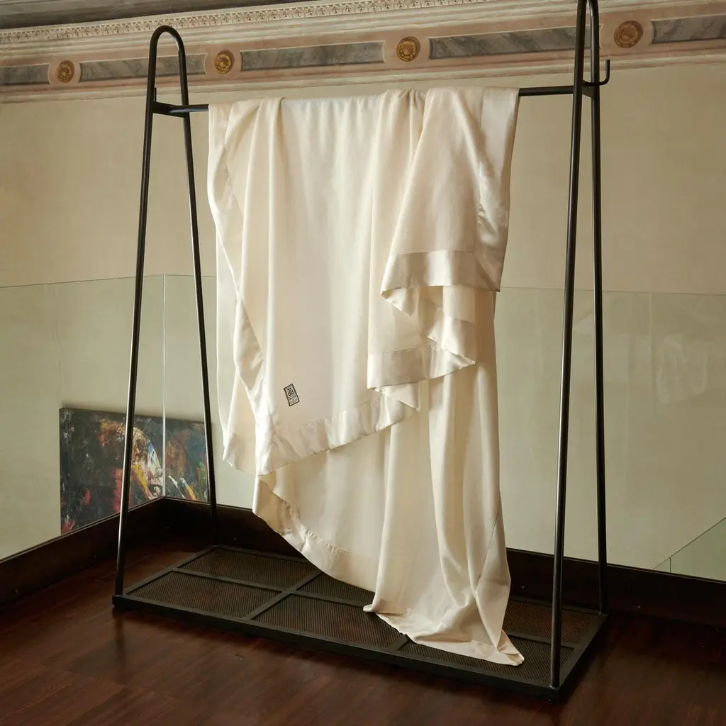 The Hollywood Ava comes in a 85% Lambswool/15% Cashmere blend milled in England at the most esteemed mill in the world, operating since 1783 with a Royal Warrant to Windsor Castle, all natural and fine fabrics. Border frame is JG Switzer signature 4 -inch 100% silk charmeuse is exquisitely hand-tailored by precision seamstresses. This is an heirloom blanket designed to be passed from one generation of bed to the next.Colors: Bespoke dye Raven Black, Champagne, or Winter WhiteDesigned to be thrown over the bed as a coverlet or tucked in. Full size blanket in very generous King (110x100") and Queen (100"x90"). Dry Clean only, please. Due to hand-sewing, mitered corners, expect slight inconsistencies as part of the charm that give each piece a bit of character. All JG SWITZER Heirloom blankets come with a lifetime silk replacement and a breathable, cotton storage bag.
