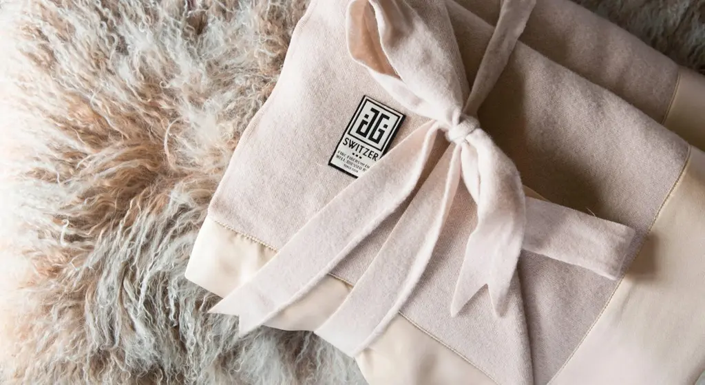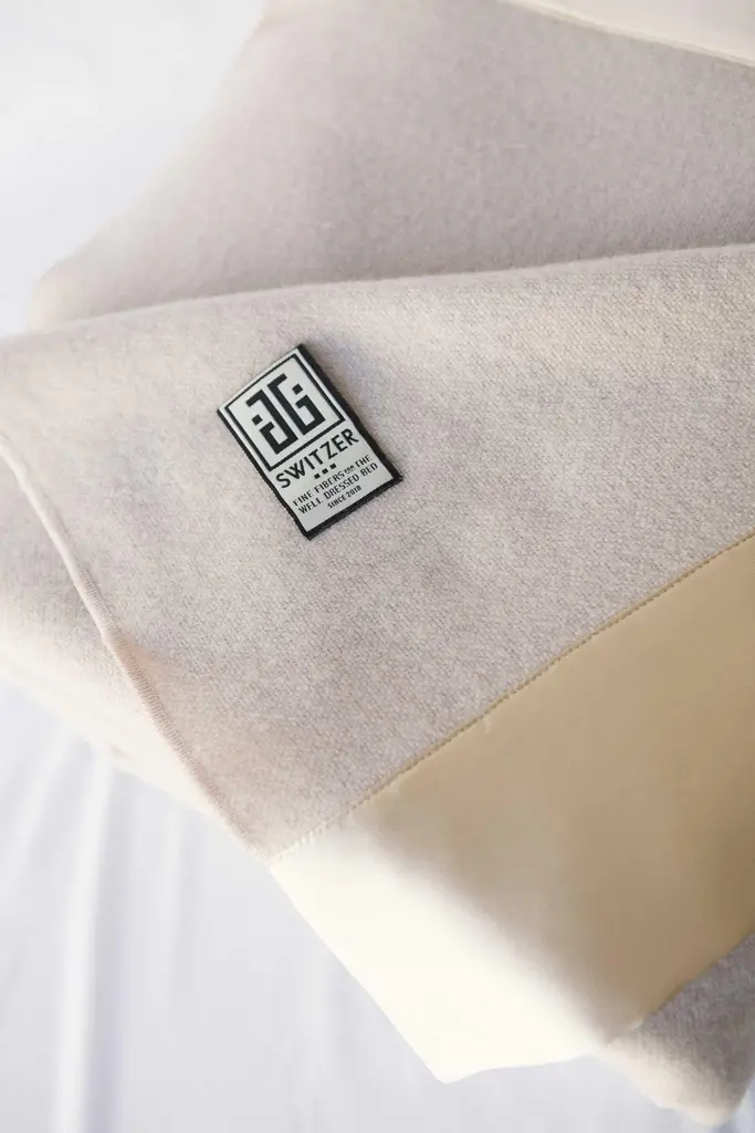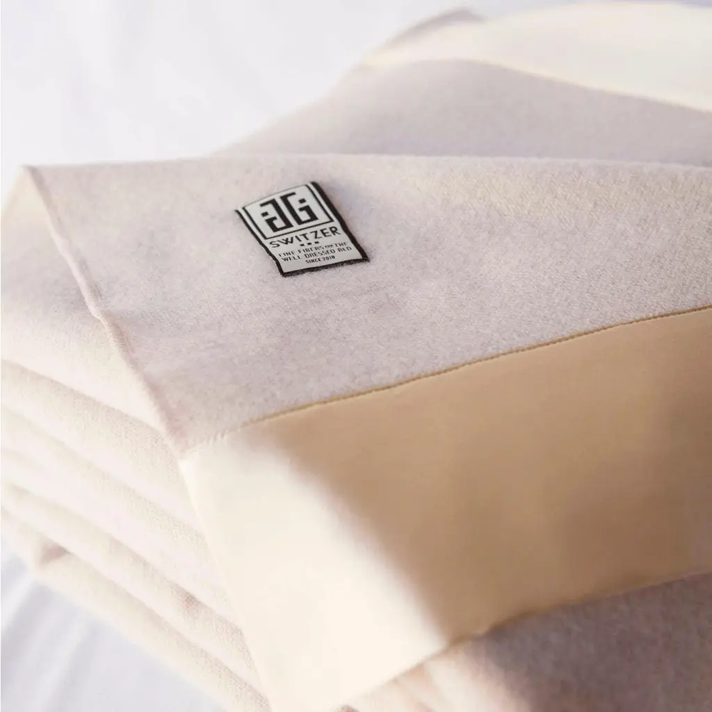 Imported woven and milled in England from 100% lambswool this is the softest wool in the world. Finished queen size and in our most popular Champagne color is the only size and color we have available this season. Finished in our JG SWITZER signature 4" top and bottom border of champagne-colored silk charmeuse.Makes a stunning heirloom gift.