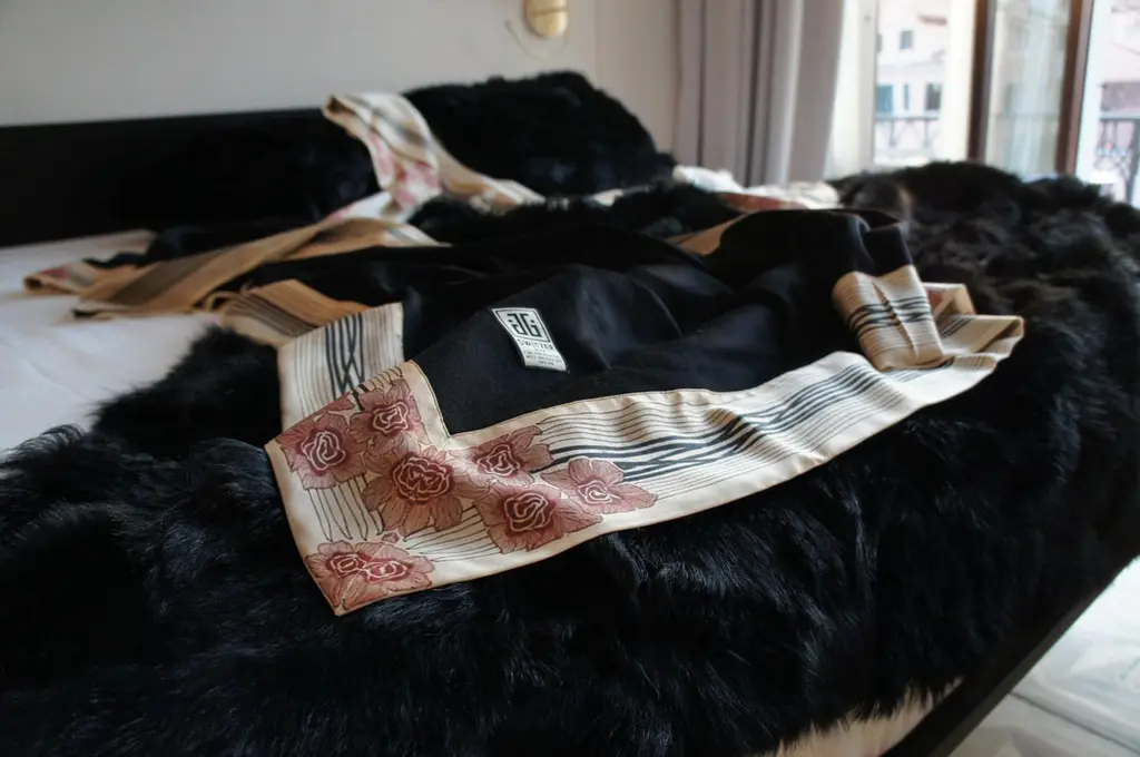 Glamour makes a comeback. Luxury Cashmere blanket with Lambswool blend. Available in king size, queen size or traveller throw - in white or raven black. Milled in England at the most esteemed mill in the world, operating since 1783 with a Royal Warrant to Windsor Castle, all natural and fine fabrics. In-house designed in California. Border frame is JG Switzer signature 4 -inch 100% silk charmeuse in an elegant rose pattern found nowhere else in the world. Inspired by the Bette Davis movie of the same name. Oh, that scene with the blanket....Now Voyager is an heirloom luxury cashmere blanket, designed to be passed from one generation of bed to the next. Hand-sewn, mitered corners means each piece has its own unique character.