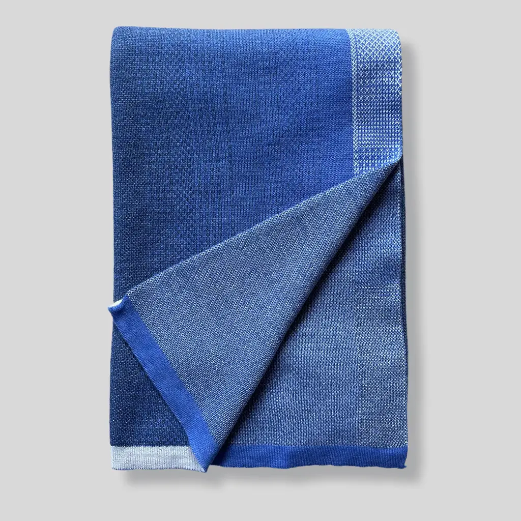 The tatami- Japanese traditional flooring - inspired the rigorous yet delicate design of this blanket. Woven from extra-fine Merino wool into a refined jacquard piqué weft, it borrows the tatami's strong graphic traits and softens it with a poetic shaded-blue coloring. An exquisite synthesis of Eastern and Western influences.