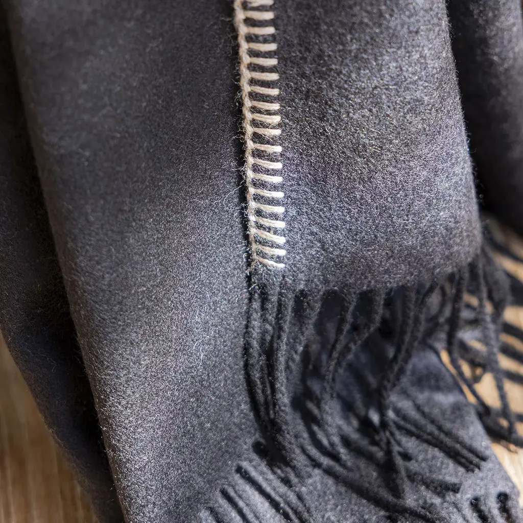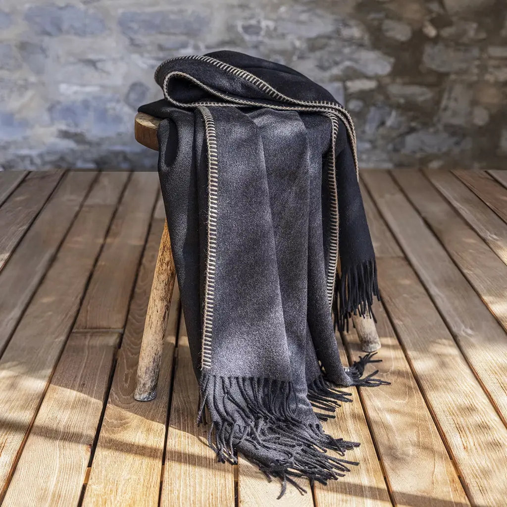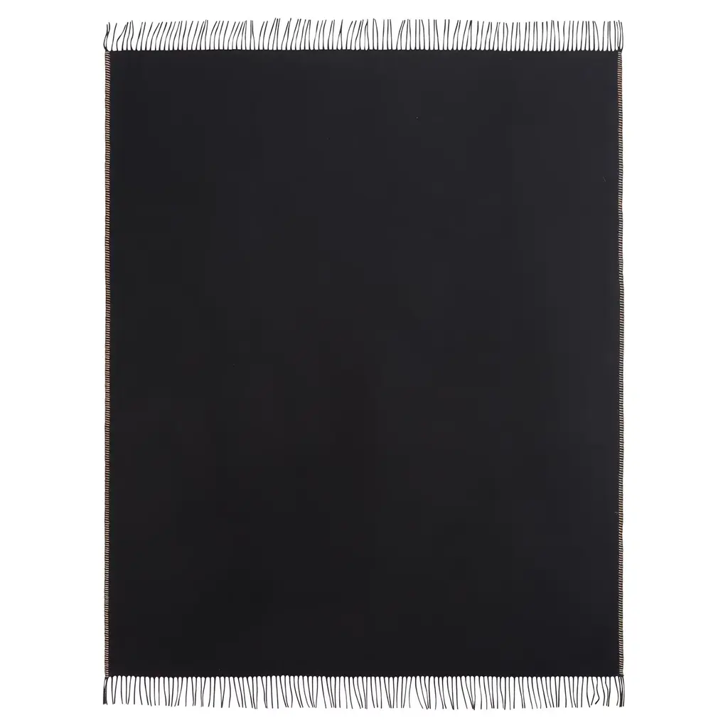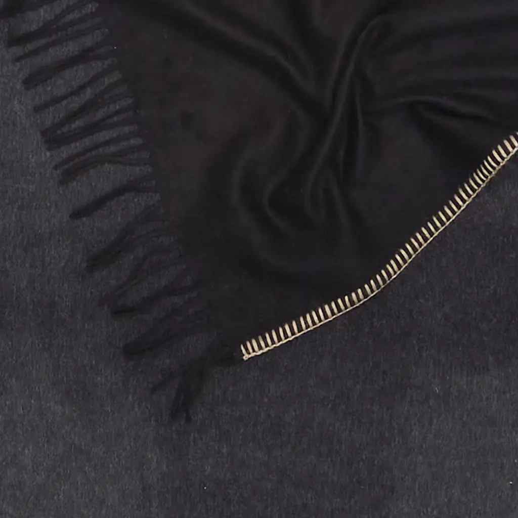 Crafted of fine cashmere, this black small blanket distills a sense of quiet elegance with its plain design only enlivened by color-contrasting, hand-sewn stitches and fringed details. The double-sided design and the selection of soft and lightweight yarn make the piece a precious addition to beds or sofas. Multiple color variants are available in the Artemest catalog.