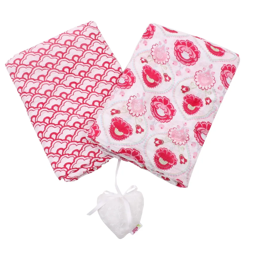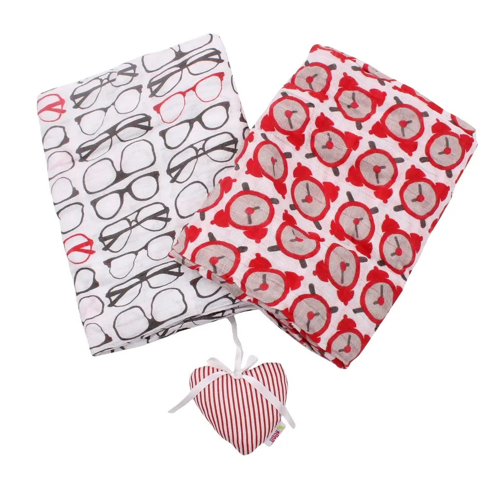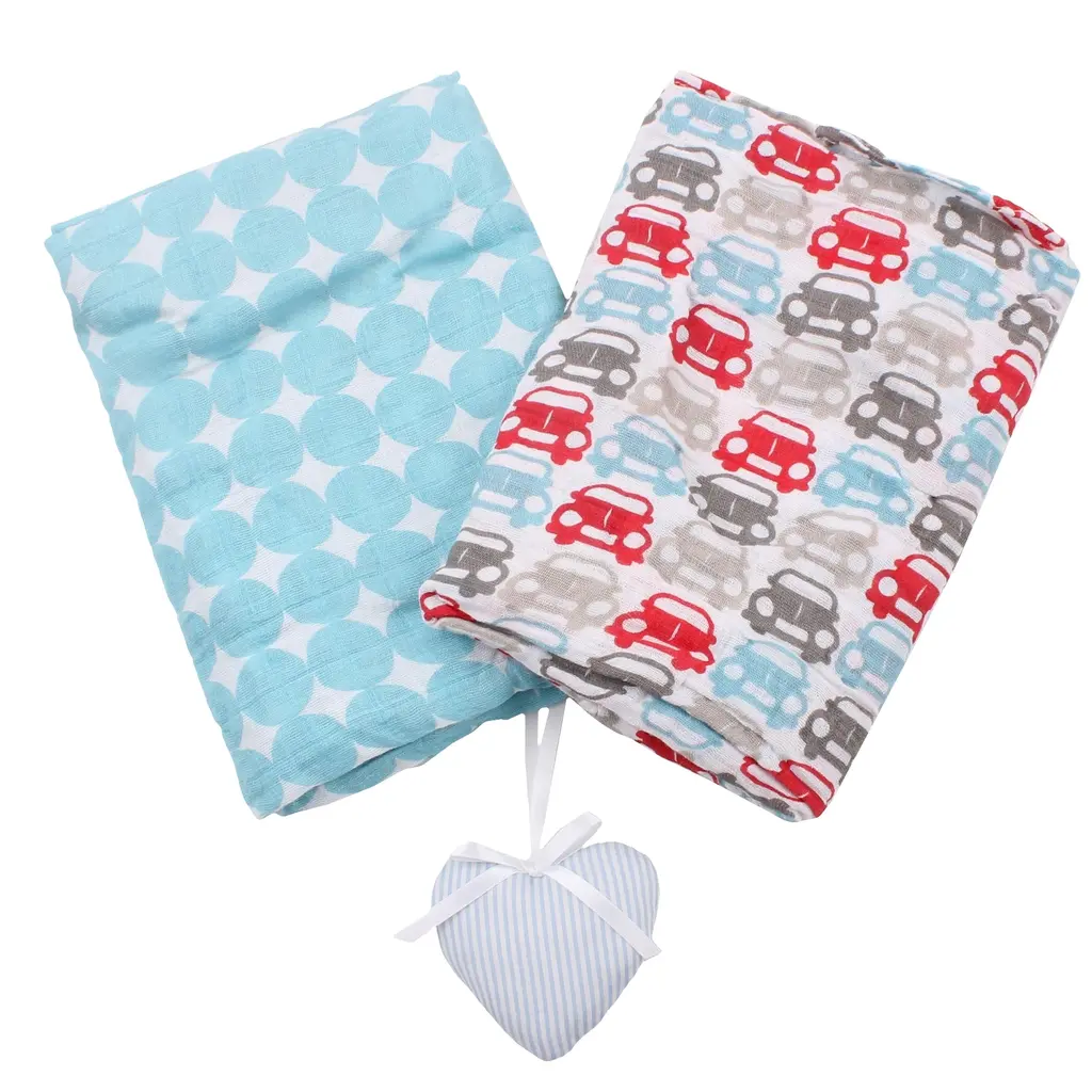This 2 pack of 100% cotton muslin swaddling cloths will come in very handy in the nursery and when traveling about with baby. With bright and fun patterns, these muslin cloths will look super cute when being used as burp or spit cloths, swaddlers, nursing covers, stroller covers and shields, travel changing blankets, security blankets and whatever you can think of. Light weight and breathable, each cloth measures 40" X 48" and is easy care, machine wash and dry. The more you wash them, the softer they get. 3 pattern combinations to choose from.