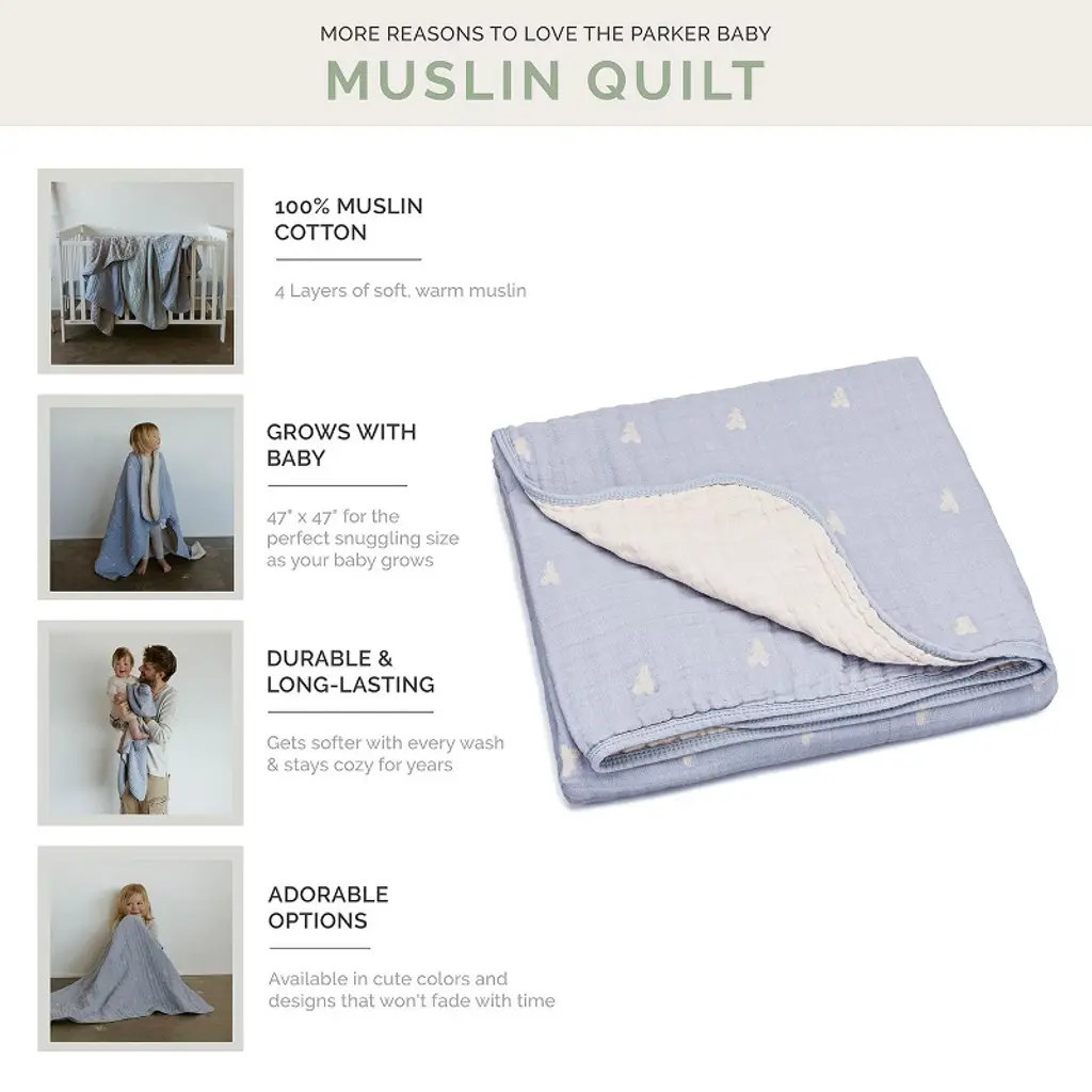 Every baby needs a cozy blanket to snuggle, and our Muslin Quilt is the perfect choice. Made with 6 layers of natural cotton, our quilts are soft, breathable, and designed to be loved for years. We’ve checked all the boxes for caring moms—pre-washed to prevent shrinking and colored with lead-free dye, making them safe for infants, toddlers, and kids. At 47" x 47", our oversized quilts provide warmth without overheating, so your little one won’t outgrow them too soon. With adorable designs that complement any nursery or child’s bedroom, they make the perfect baby shower gift, registry essential, or cozy addition to your home.