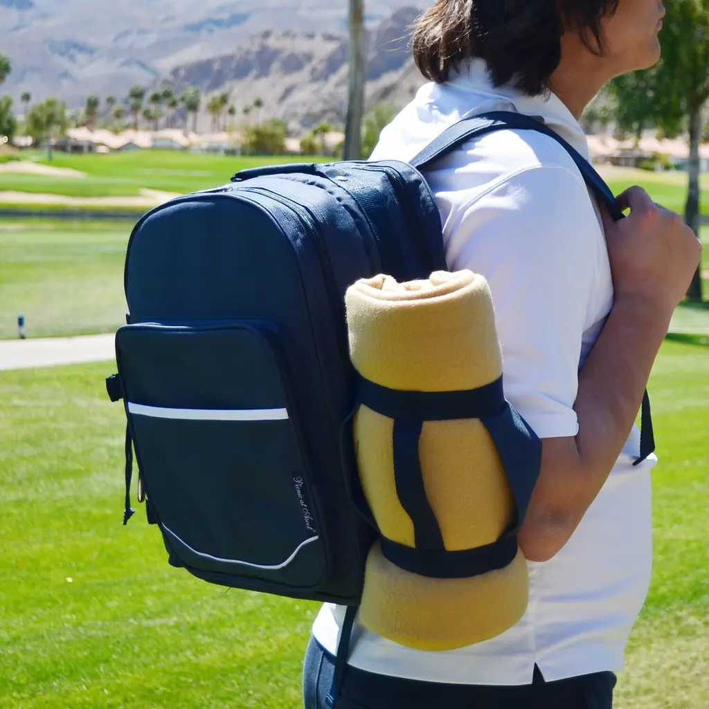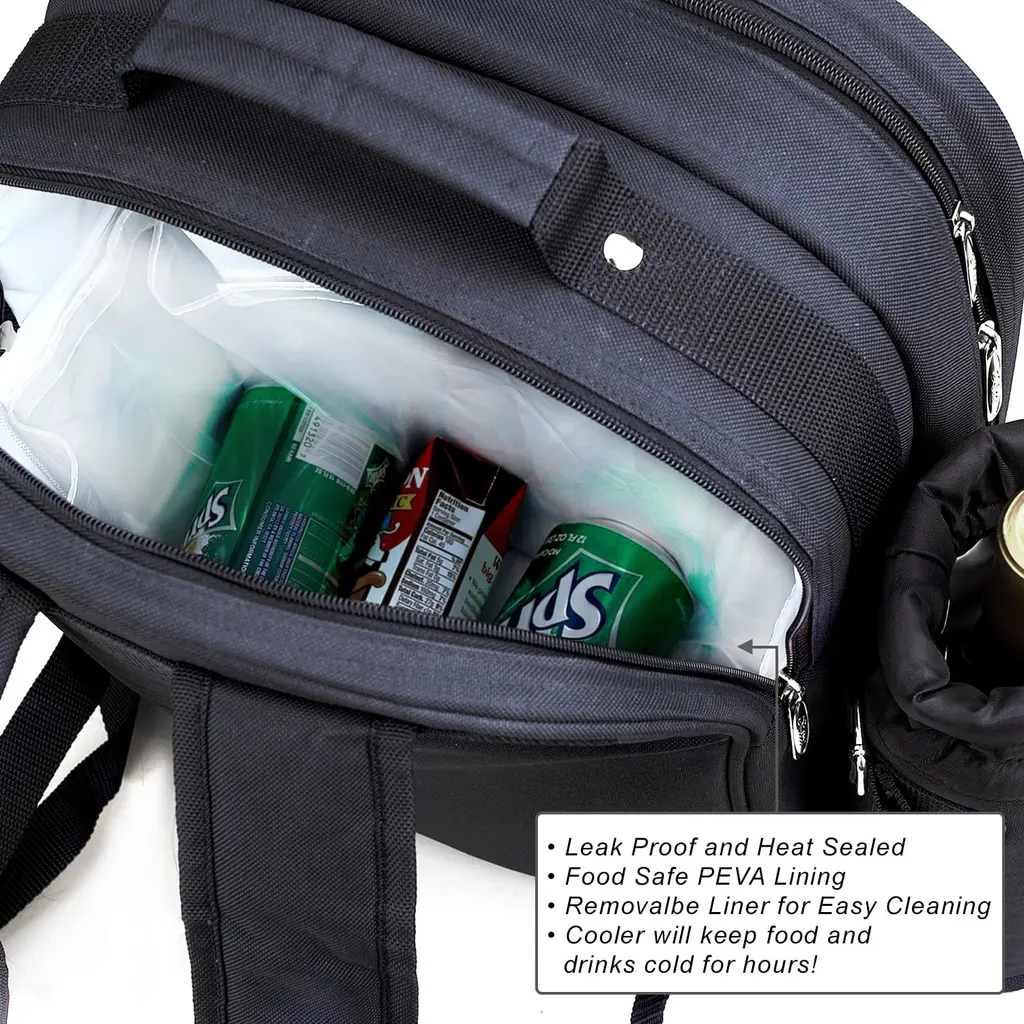 Our Fully equipped picnic backpack for four with blanket has modern white accents, convenient detachable wine holder, and Thermal Shield insulated cooler compartment to keep food and drink at the perfect temperature. Includes 50" x 60" acrylic blanket and carrier, combination corkscrew, hardwood cutting board, cheese knife, wood salt & pepper shakers with non spill tops, acrylic wine glasses, 9" melamine plates, stainless steel flatware, and napkins. This modern picnic basket has a stylish design and is constructed of 600D polycanvas. Designed and Assembled in the USA. Lifetime Warranty.