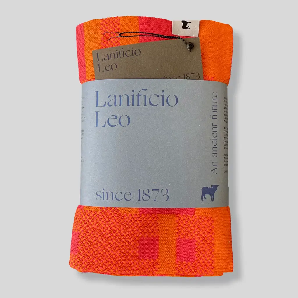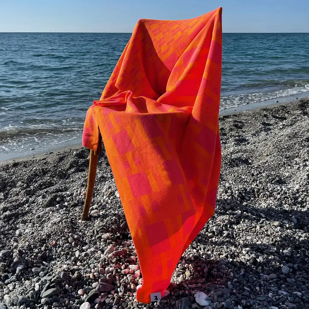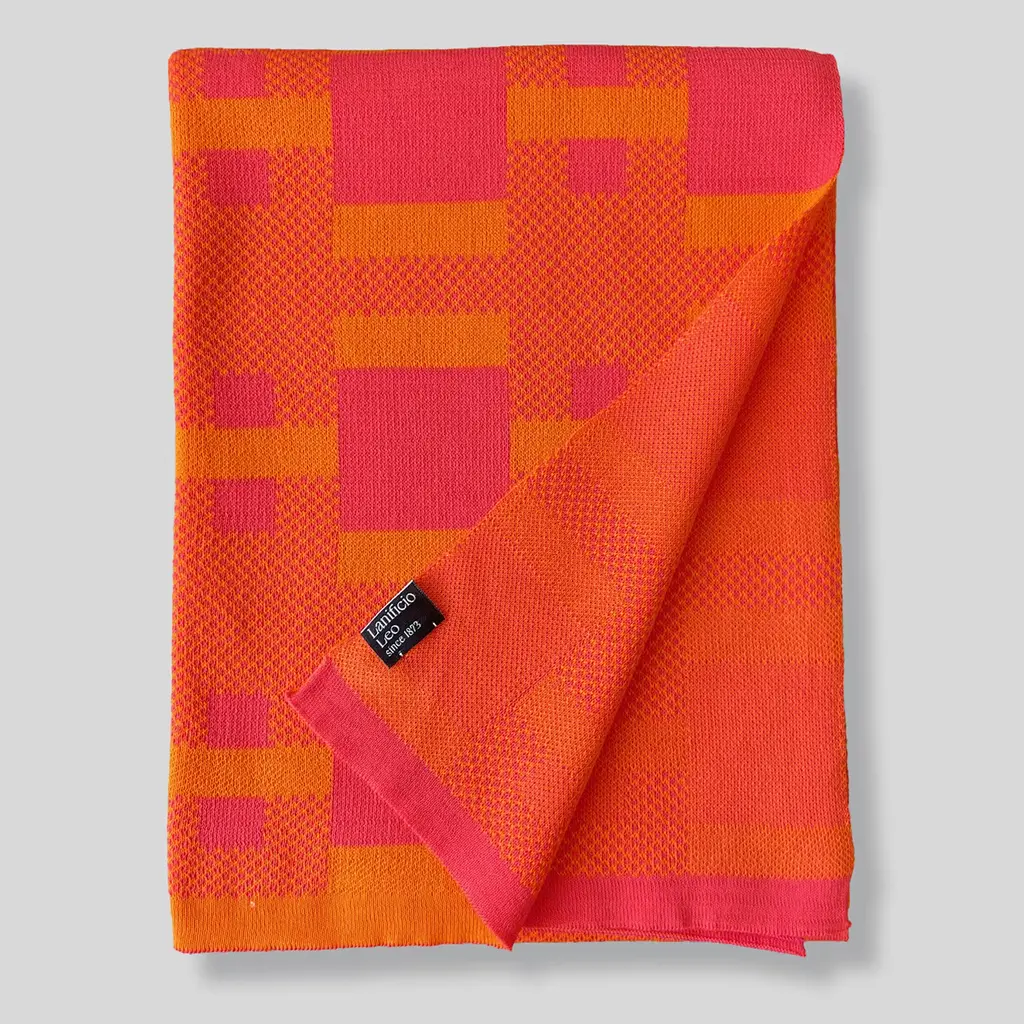 Vibrant shades of orange and red are the ones selected for this stylish jacquard piqué-weft blanket, a precious piece obtained from the weaving of fine bio four-ply cotton yarns. The characteristic pattern it flaunts belongs to a computational project where graphic motifs are randomly generated using a Max/MSP code. A yellow version is also available in the Artemest catalog.