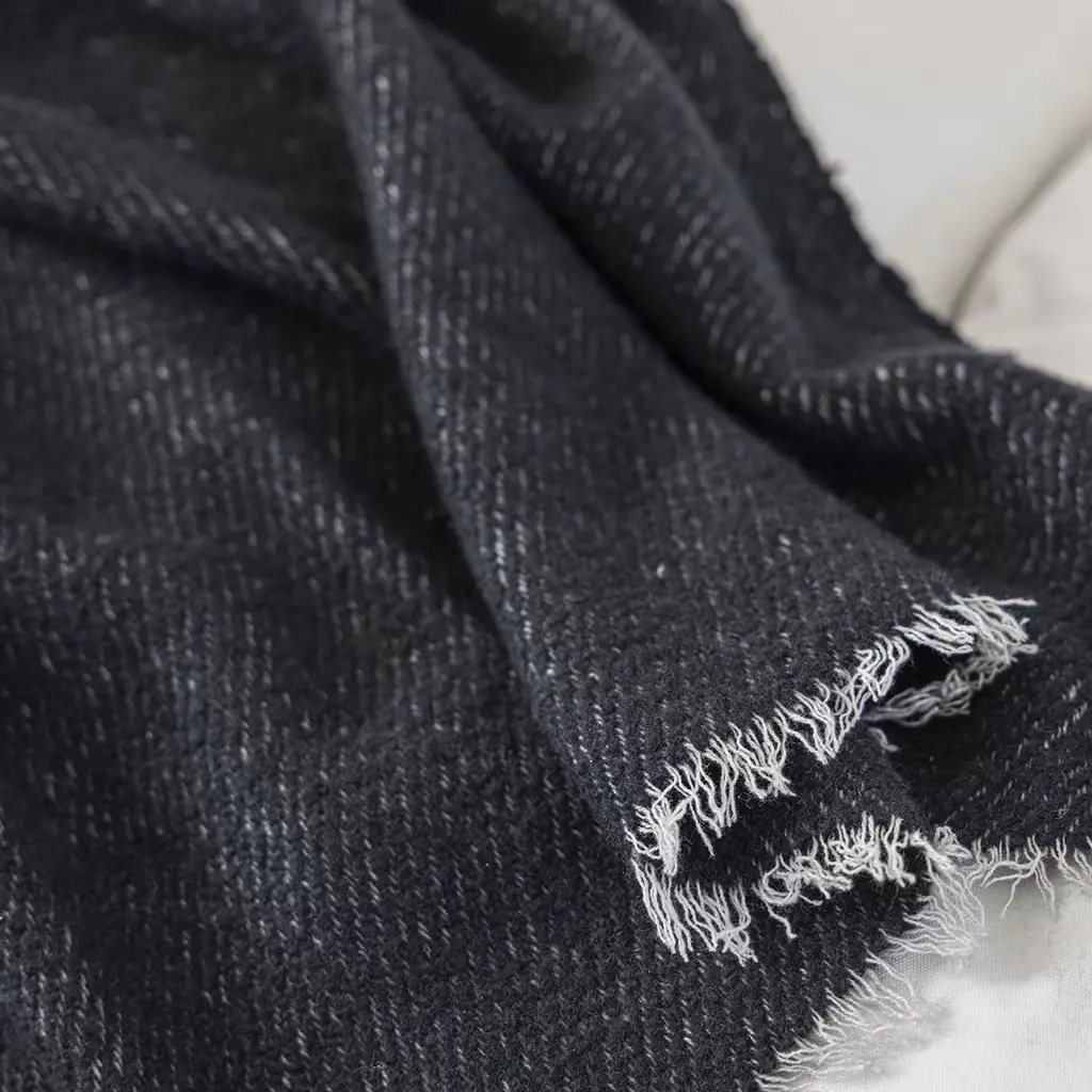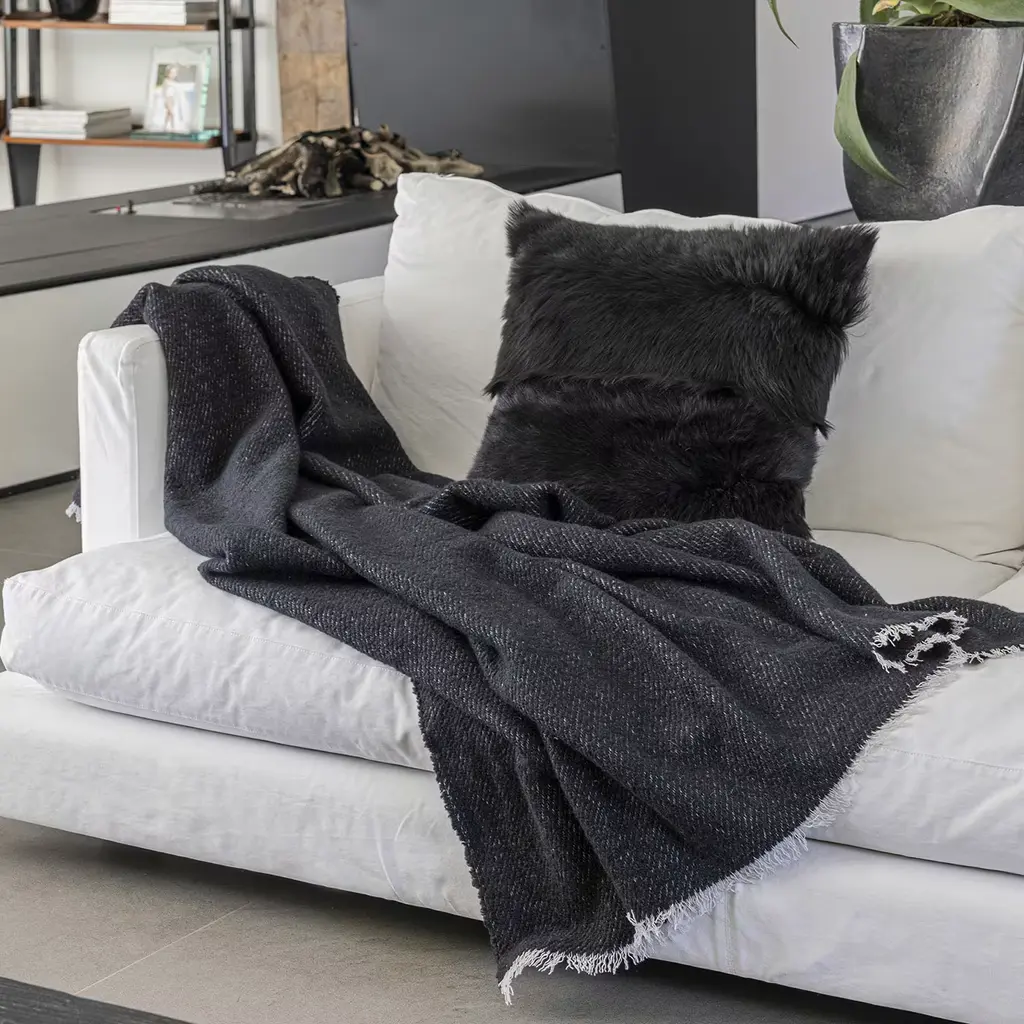 This sophisticated small blanket was conceived with coziness and elegance in mind. Deftly crafted from a blend of selected 88% cashmere and 12% silk, it stands out for the weft's utmost softness, lightness, and warmth, characteristics favoring its use while either relaxing on the sofa or taking a nap in bed. A white and a light-brown version are also available in the Artemest catalog.