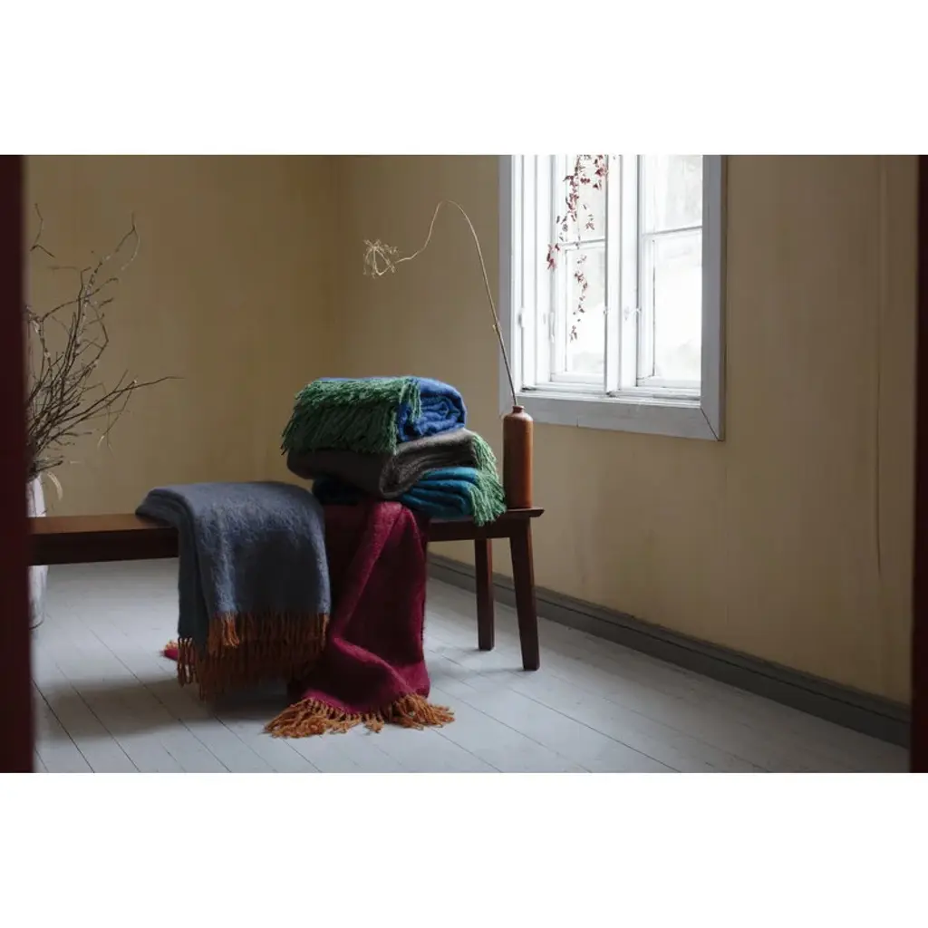 The Revontuli mohair blanket by Lapuan Kankurit is colored in beautiful, rich tones inspired by the northern lights – Revontuli is Finnish for Aurora Borealis. The luxuriously soft mohair blanket, designed by Elina Helenius, is woven in two colors and has fringes on the edges. The Revontuli blanket is made of mulesing-free South African mohair and New Zeeland wool in a Lithuanian sewing company.