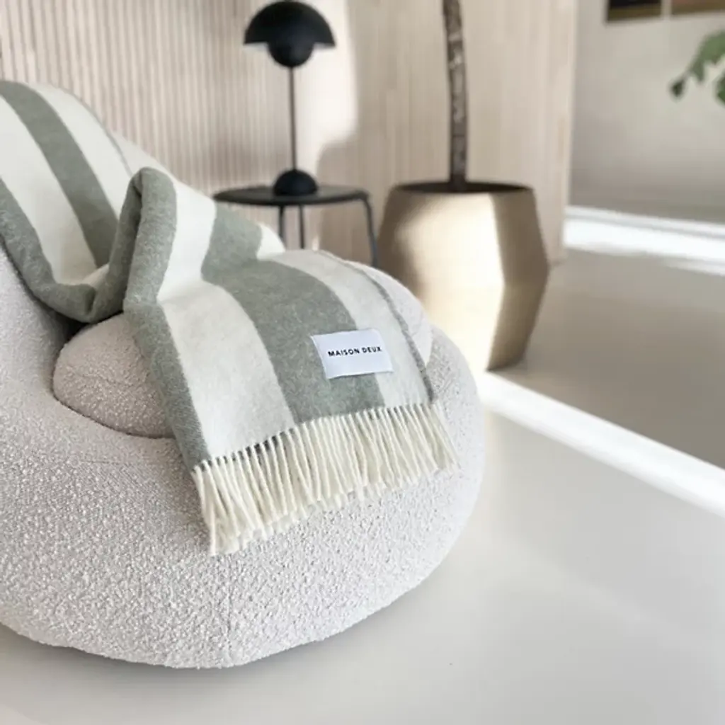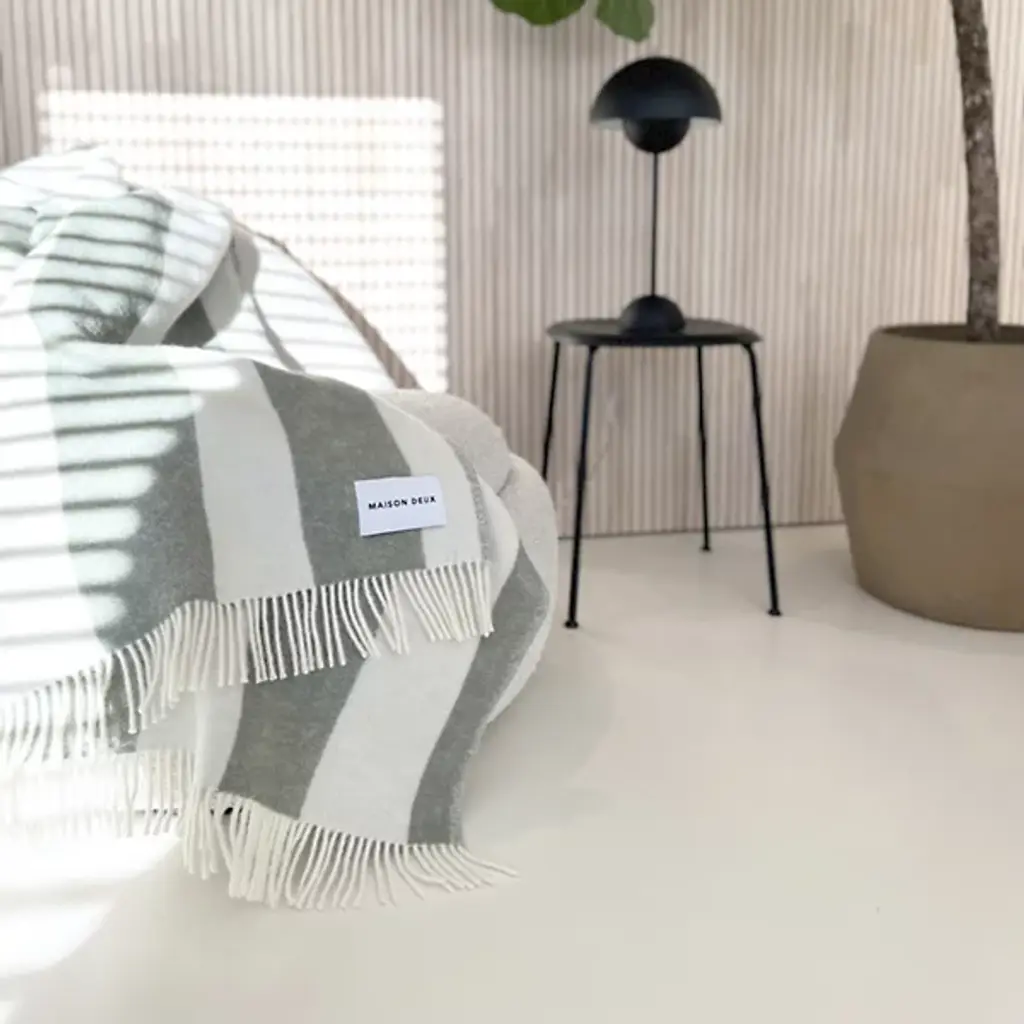The Rough Stripe Blanket from Maison Deux is jacquard-woven from 100% New Zealand wool and features fringed edges. It’s generously sized for cozy moments alone or with a companion. This reversible, premium-quality blanket adds warmth and style to your space instantly. Woven in Lithuania, it’s Woolmark and OEKO-TEX certified, ensuring sustainability and eco-friendliness, as wool is completely biodegradable and free from microplastic pollution.