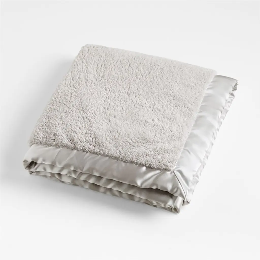 All the feels. The fleecy texture of our satin-trimmed baby blanket in neutral luminous grey is so soft, you'll wish it came in adult sizes too. It features a satin edge for a refined look and can be personalized for an extra-special baby gift.