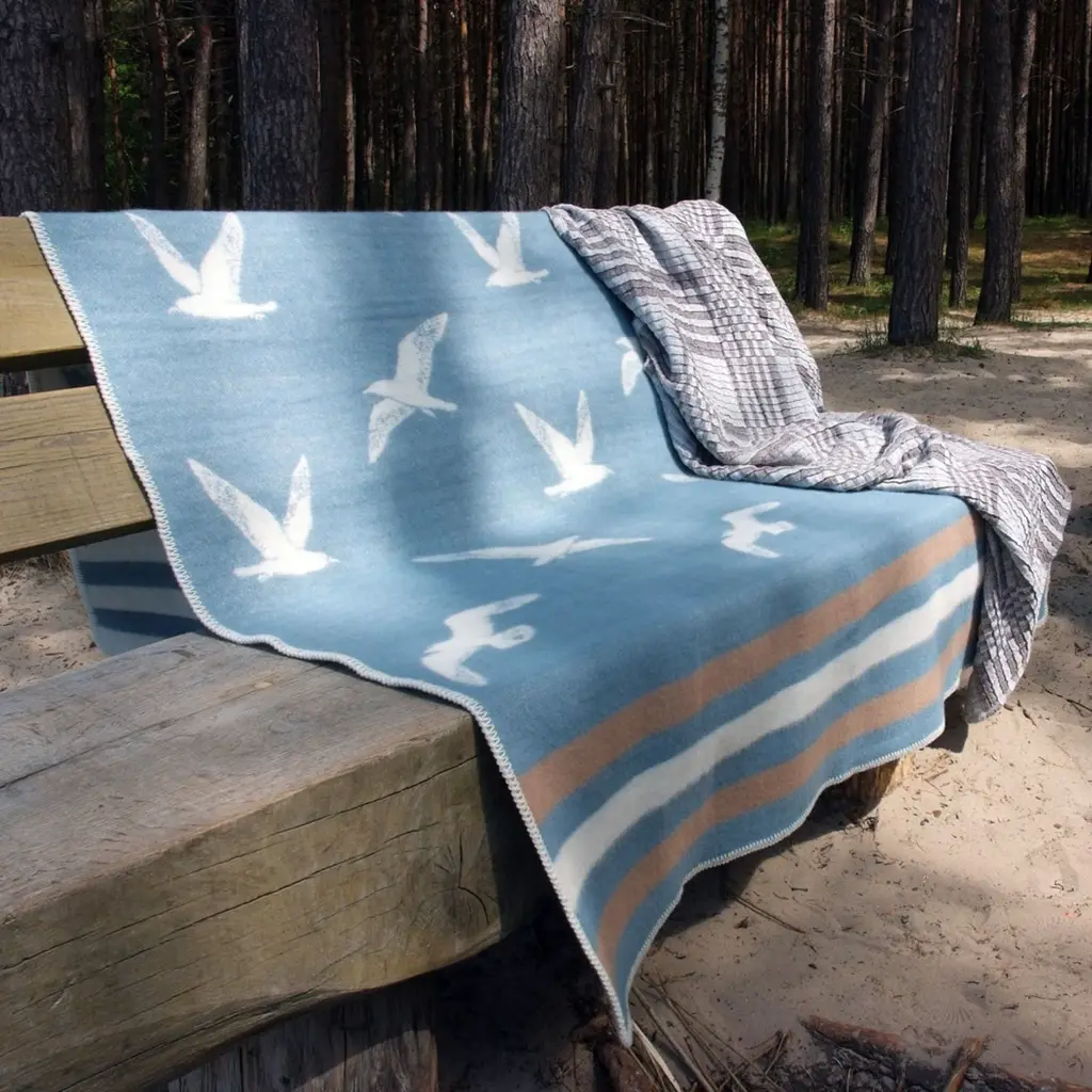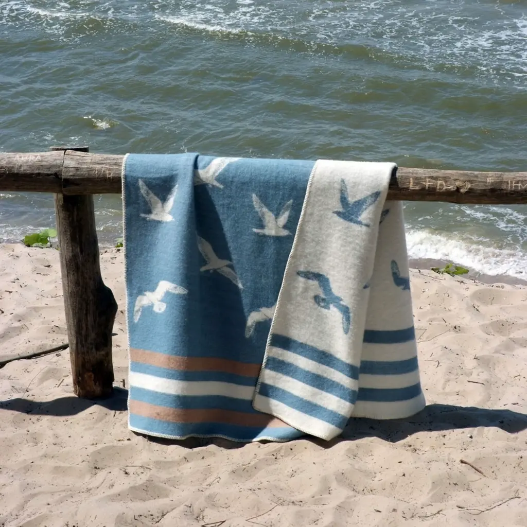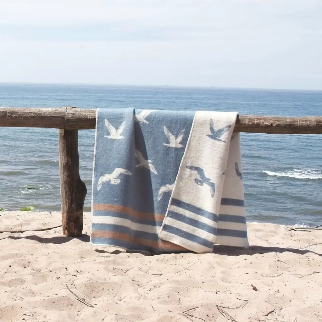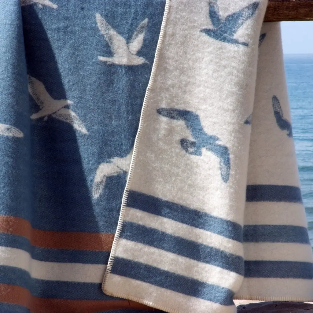 You can almost feel the sand between your toes and smell the sea air with this seaside themed, pure 80% wool 20% cotton stitched blanket featuring a flock of white seagulls. The perfect sea blue and soft brown nautical blanket–you can invite the seagulls to your picnic without risking your sandwiches! 130 x 180 cm