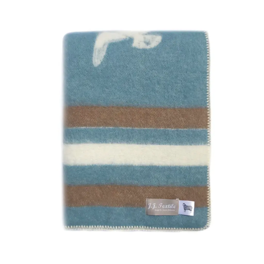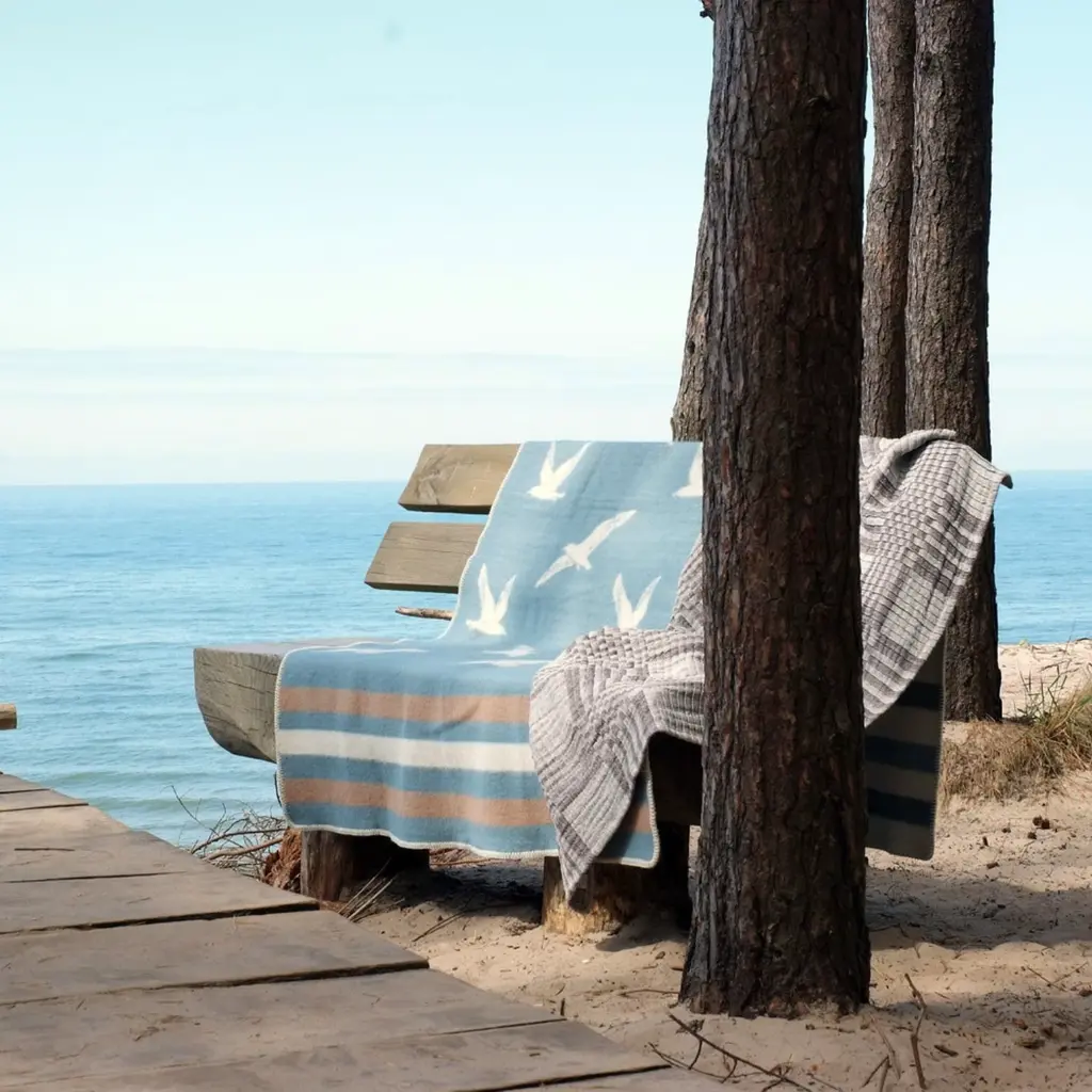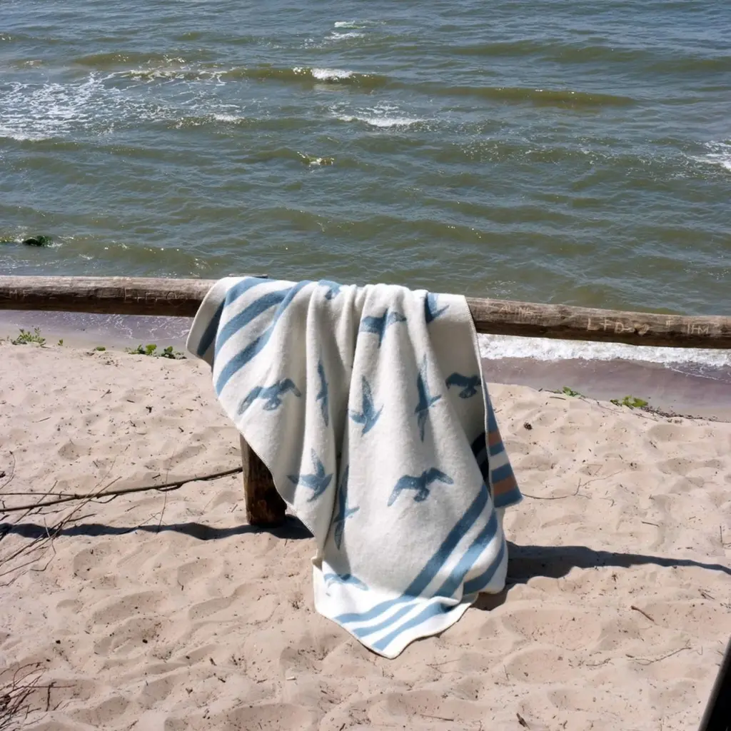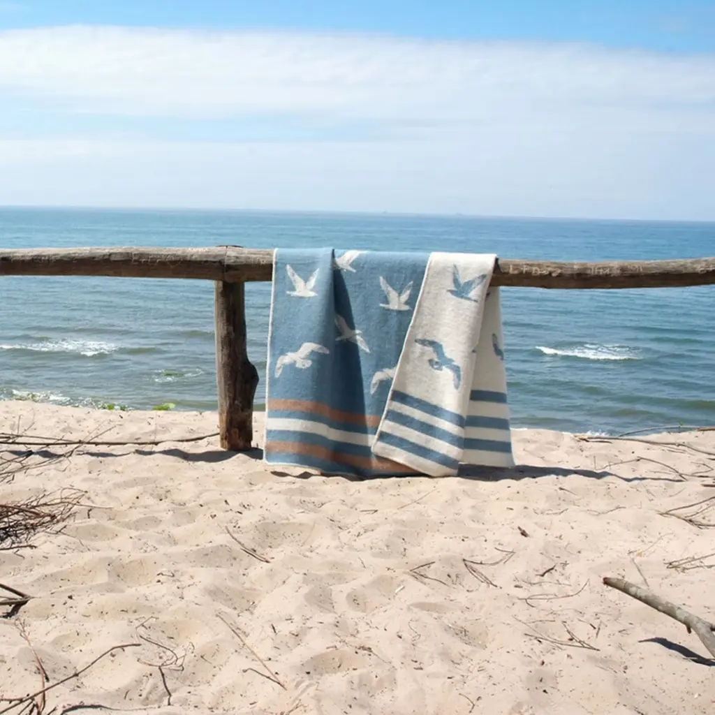 You can almost feel the sand between your toes and smell the sea air with this seaside themed, pure 80% wool 20% cotton stitched blanket featuring a flock of white seagulls. The perfect sea blue and soft brown nautical blanket–you can invite the seagulls to your picnic without risking your sandwiches! 130 x 180 cm