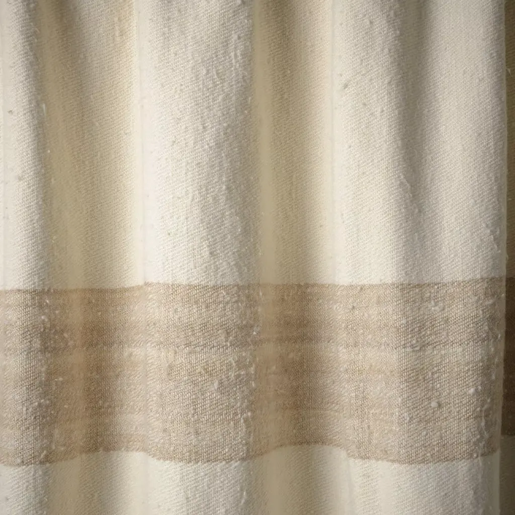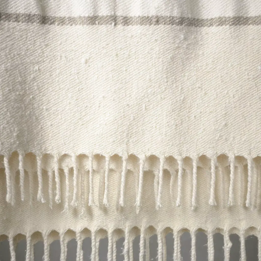 Sophisticated neutral shades and a distinctive texture characterize this elegant blanket, a precious artisan design evocative of shores. Enlivened by bold fringes, the weft blends fine linen and silk yarns to create a striped pattern that, reinforced by the delicate neutral palette, lends the blanket its versatile elegance.