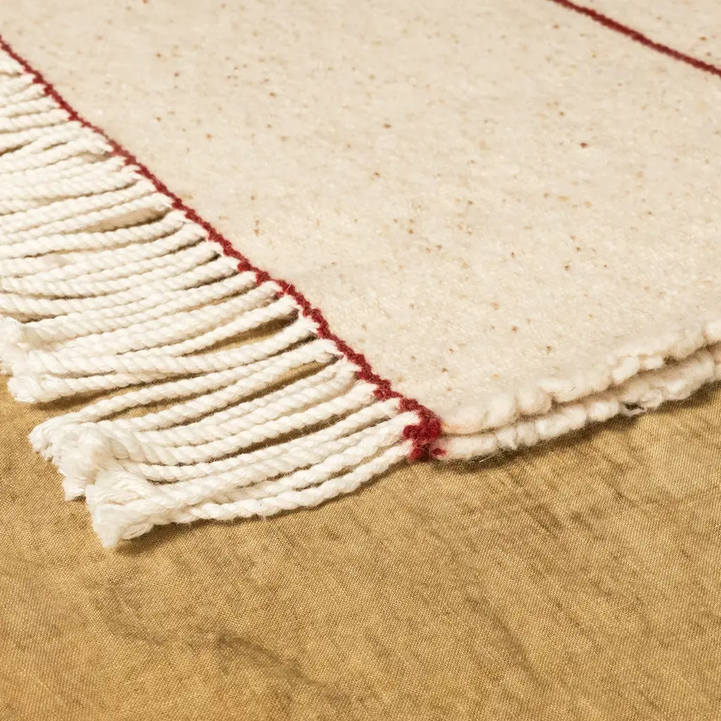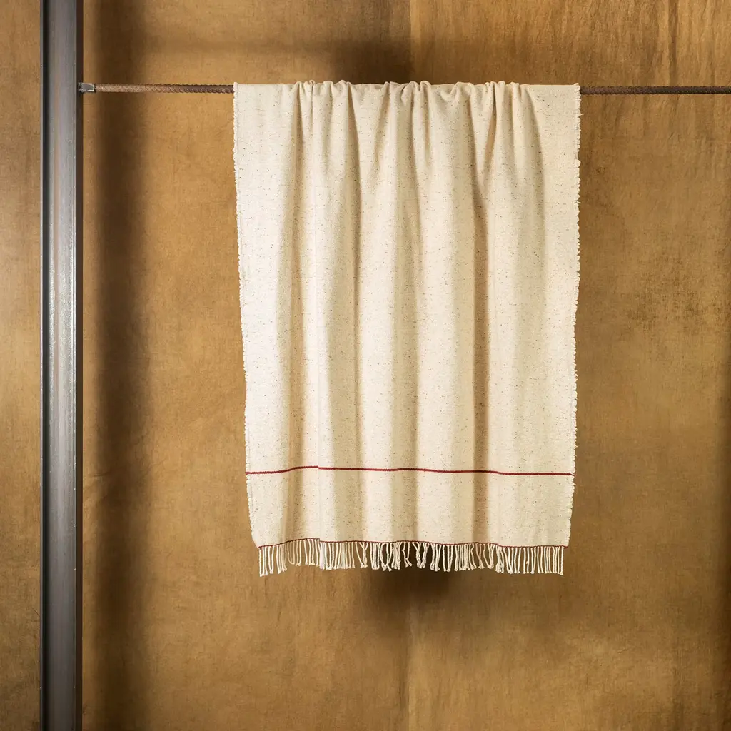 Quiet refinement is exuded by this fine blanket, distinguished by the natural effect the raw yarn flaunts. Blending virgin wool, cotton, and polyamide fibers in 51%, 36%, and 13% respectively, ensures exceptional warmth and breathability, for the blanket to be an ideal solution to cuddle into when seeking pure relaxation. Lively fringes and thin red lines seal the design.
