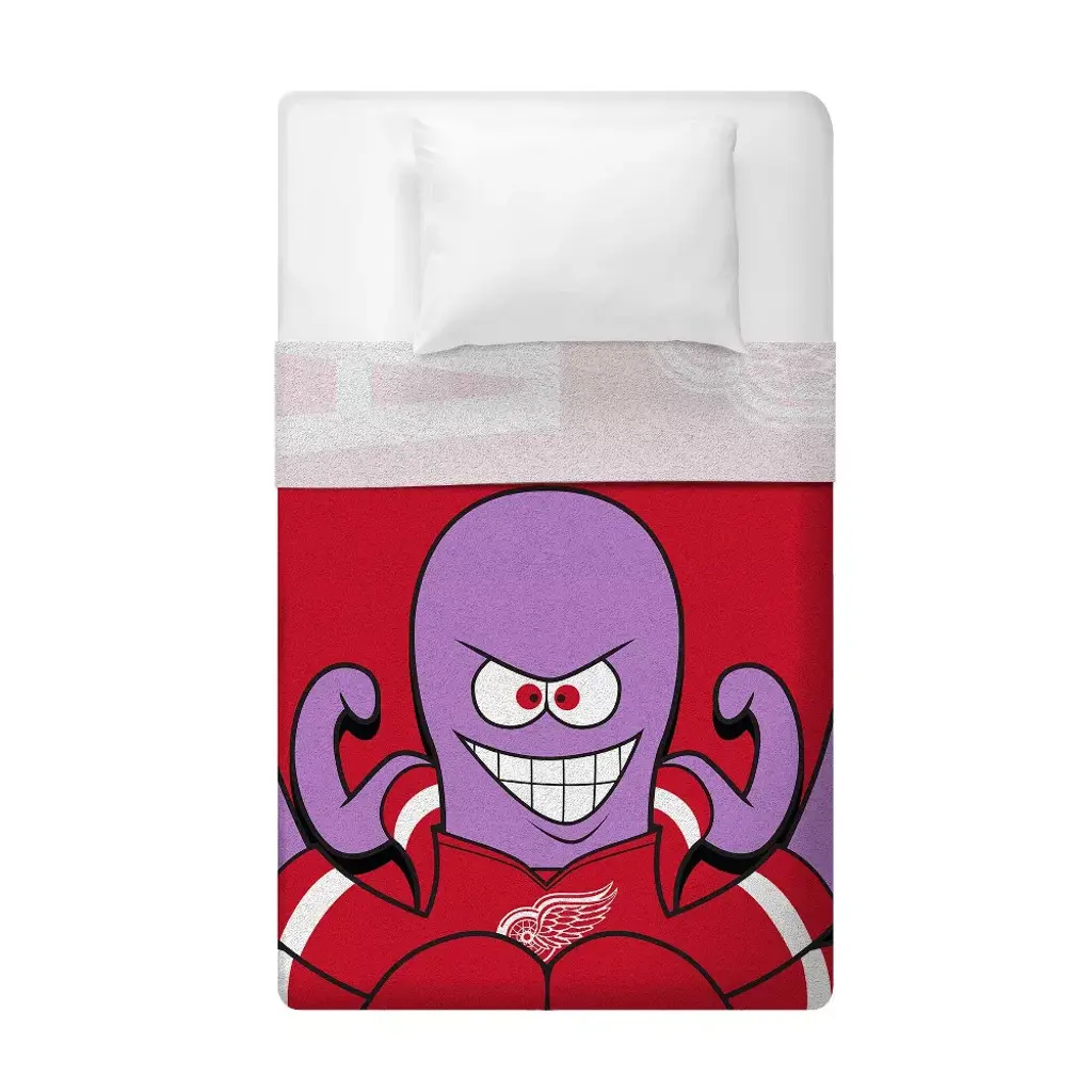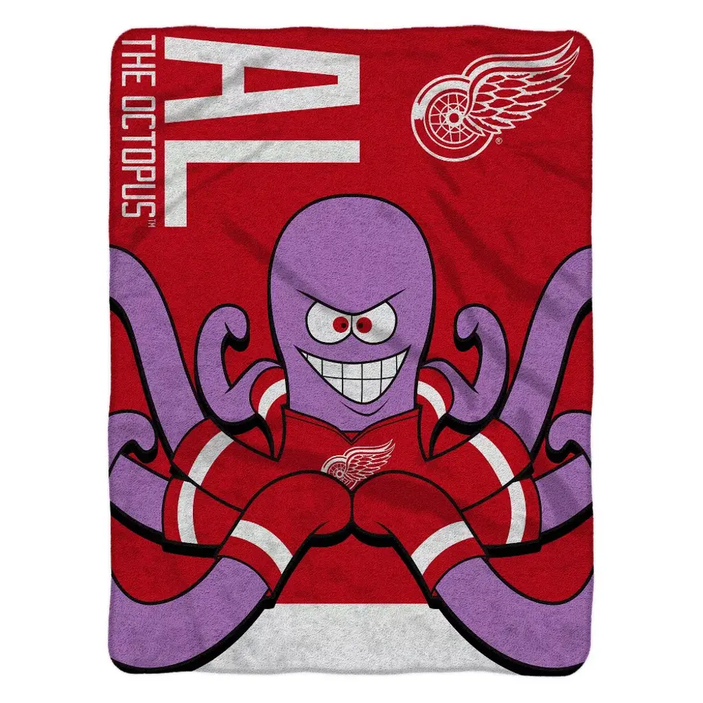 Sleep Squad Detroit Red Wings Rally Al 60" x 80" NHL Raschel Plush Blanket An NHL Mascot Super-Soft Throw. This Detroit Red Wings Rally Al mascot throw blanket is 60" x 80, made with super-soft Raschel knit with a soft and luxurious feel. Made with 100% polyester, it is machine washable, officially licensed by the NHL and the Detroit Red Wings. Great for chilling on the couch while watching the Red Wings, picnics, camping and chilling. The size can allow this throw to be used as a twin size bedspread.
