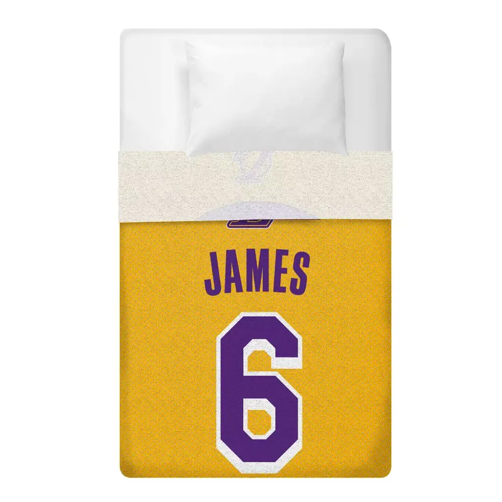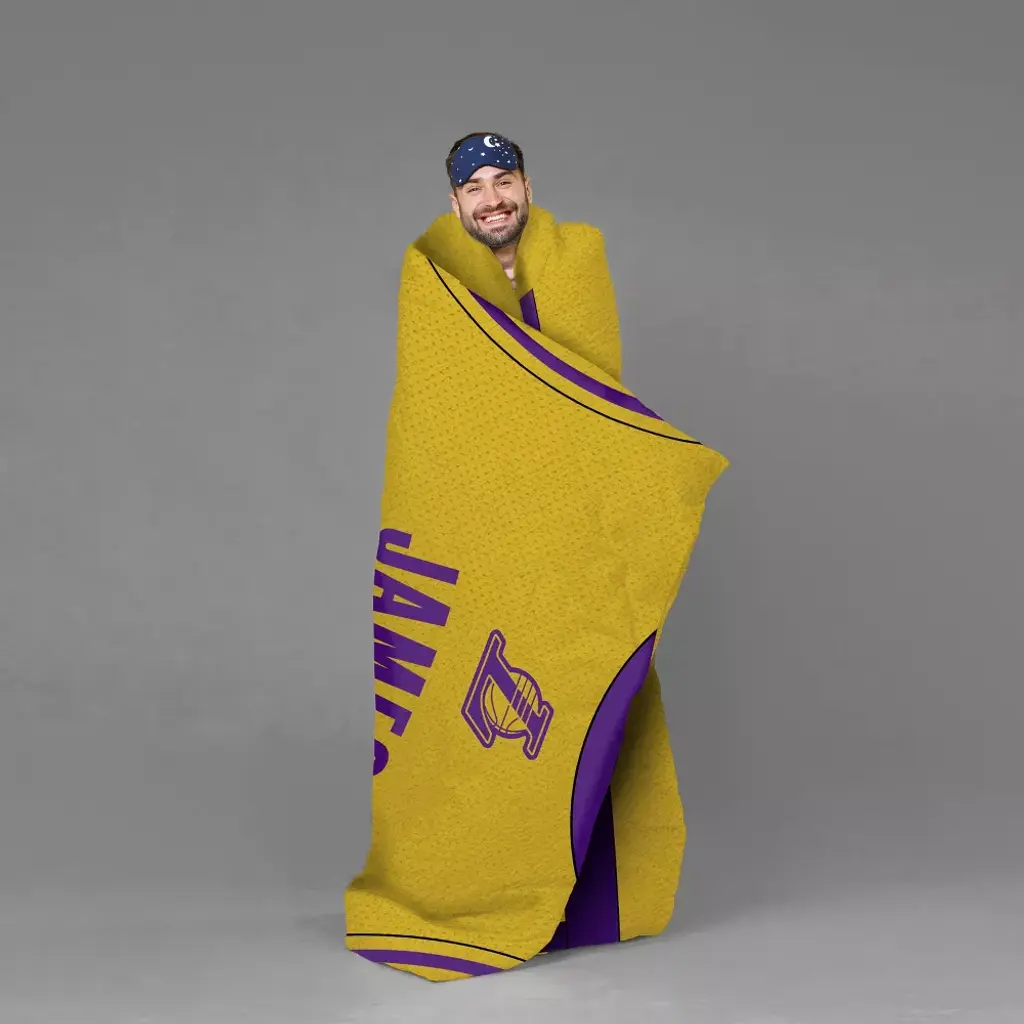 Sleep Squad NBA Los Angeles Lakers LeBron James 60 x 80 Raschel Plush Blanket-An NBA Mascot Super-Soft Throw. This Los Angeles Lakers LeBron James jersey throw blanket is 60 x 80, made with super-soft Rachel knit with a soft and luxurious feel. Made with 100% polyester, it is machine washable, officially licensed by the NBA, NBA Players and the Los Angeles Lakers. Great for chilling on the couch while watching the Lakers, picnics, camping and chilling. The size can allow this throw to be used as a twin size bedspread.
