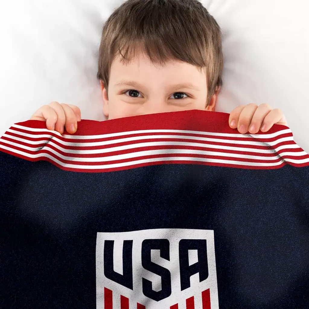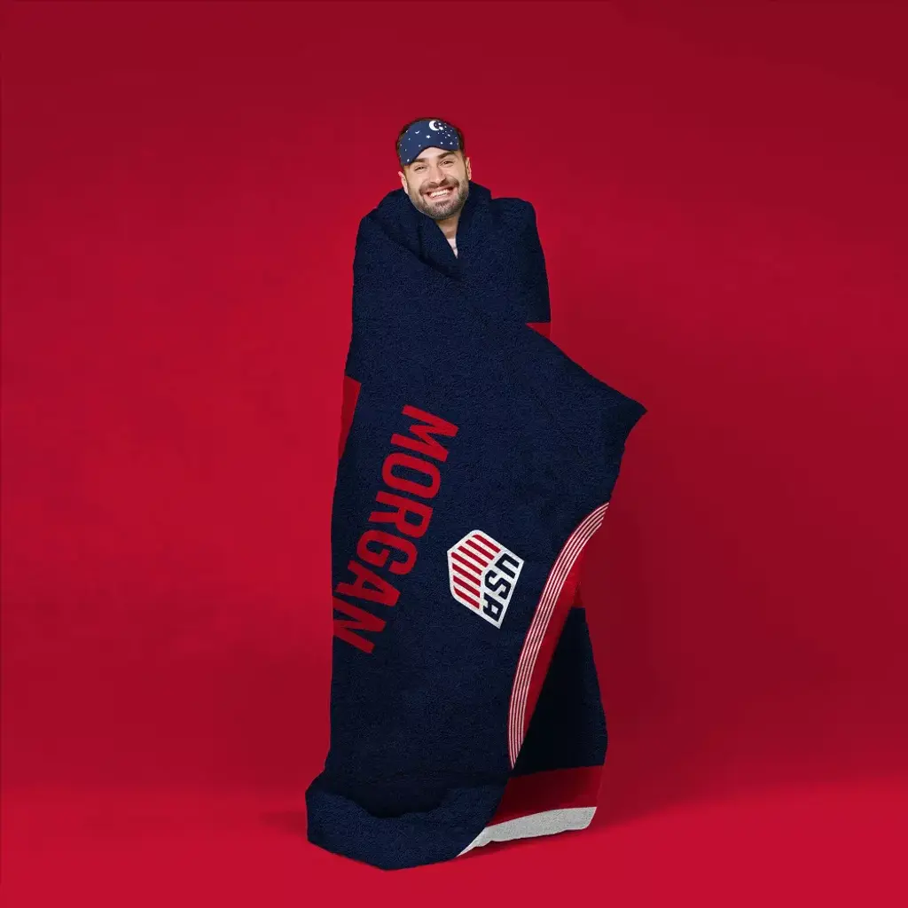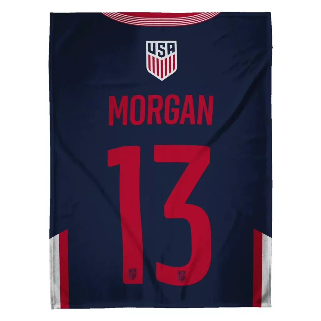 Sleep Squad US Women's Soccer Alex Morgan 60 x 80 Raschel Plush Blanket A USA Soccer Throw. This US Women's Soccer Alex Morgan throw blanket is 60 x 80, made with super-soft Raschel knit with a soft and luxurious feel. Made with 100% polyester, it is machine washable, officially licensed by USA Soccer.Great for chilling on the couch while watching the US Women's Soccer games, picnics, camping and chilling. The size can allow this throw to be used as a twin size bedspread.