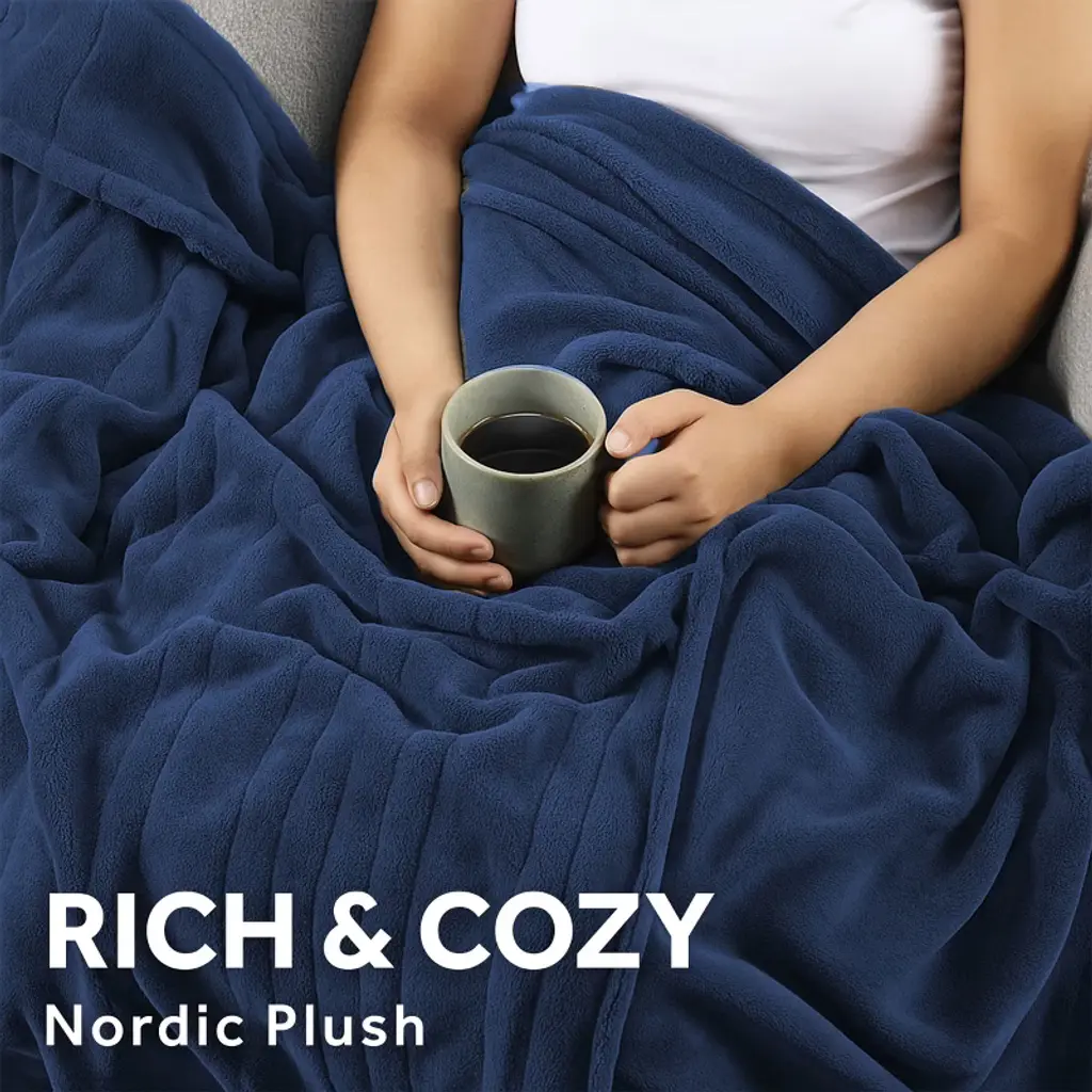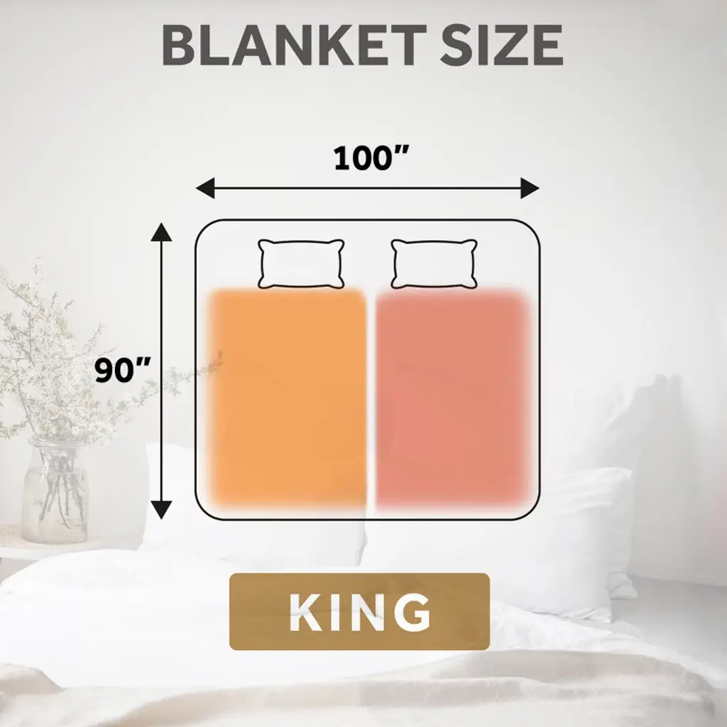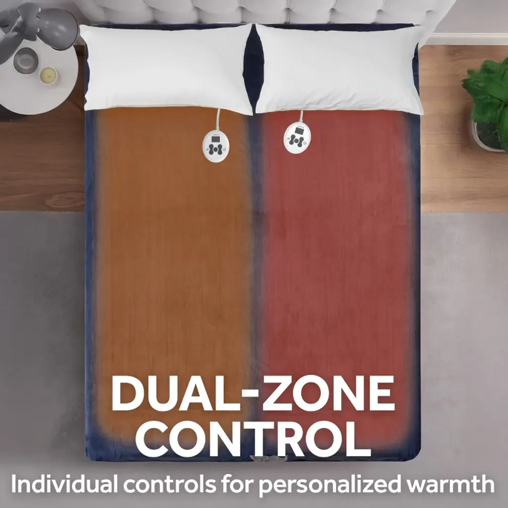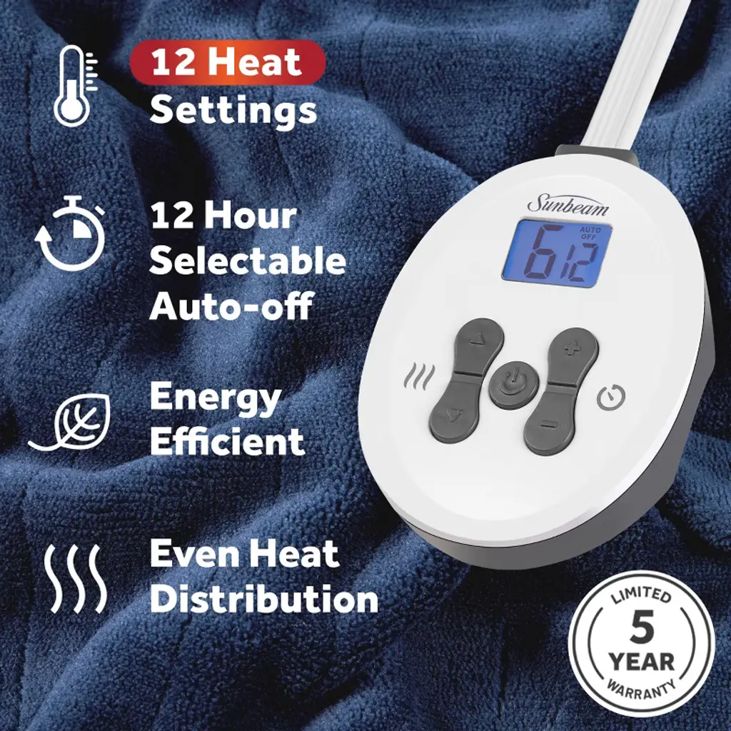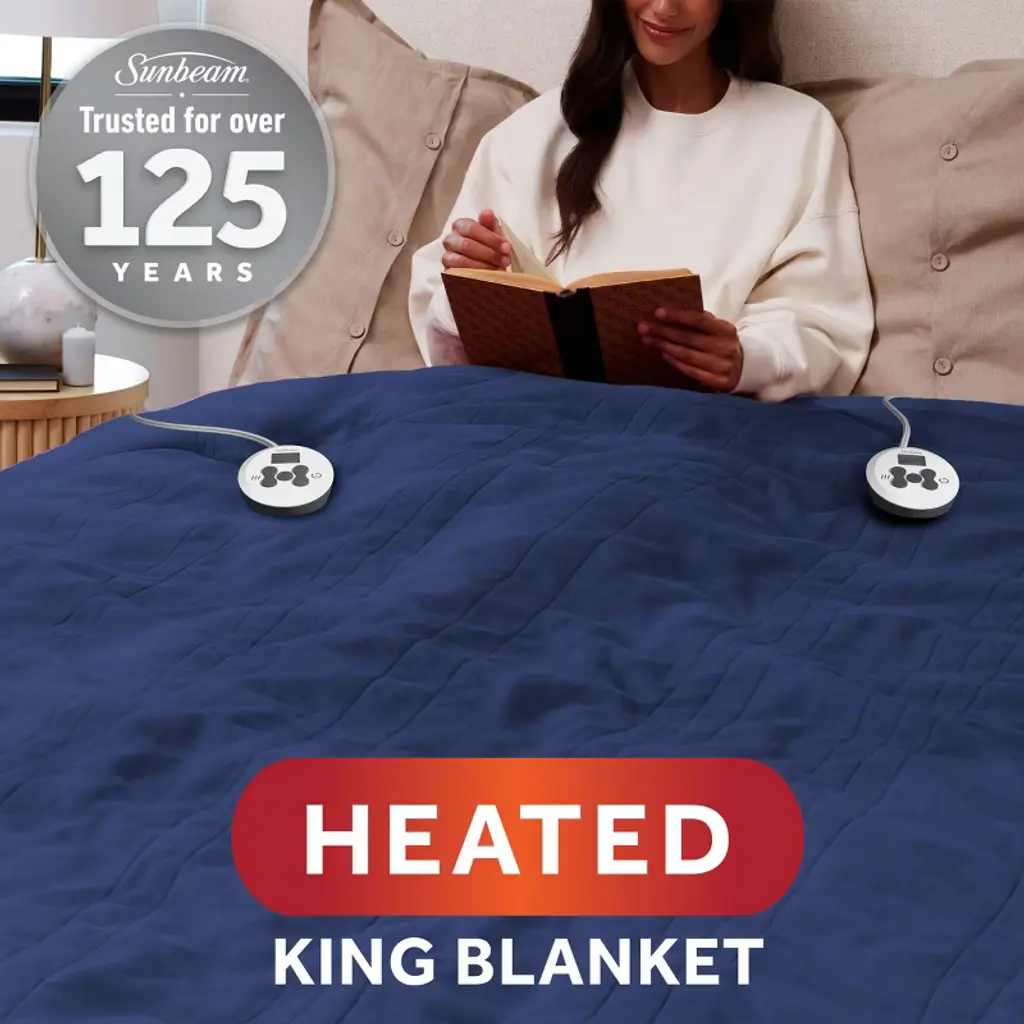 Sunbeam Nordic Plush Heated Blanket in King size (100" x 90") surrounds you in rich, cozy warmth on chilly nights. Made from ultra-soft Nordic plush fabric in a deep blue color, this blanket adds a bold, inviting accent to your bedroom décor.The dual digital controllers let each side of the bed choose from 12 adjustable heat settings for individualized comfort. Each controller’s backlit LED display dims after 10 seconds and remembers your last setting for uninterrupted rest. Premium heating wires sense and adjust to maintain consistent, even heat throughout the night. Safety features include a 12-hour auto shut-off and overheat protection for peace of mind.When it’s time to clean, simply detach the controllers and place the blanket in the washing machine—it stays soft wash after wash.Sunbeam—bringing trusted warmth and comfort to homes for over 125 years.