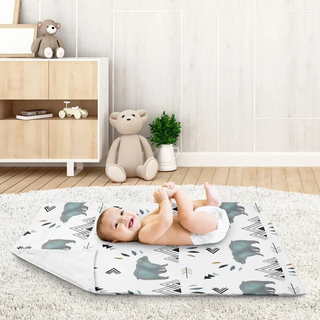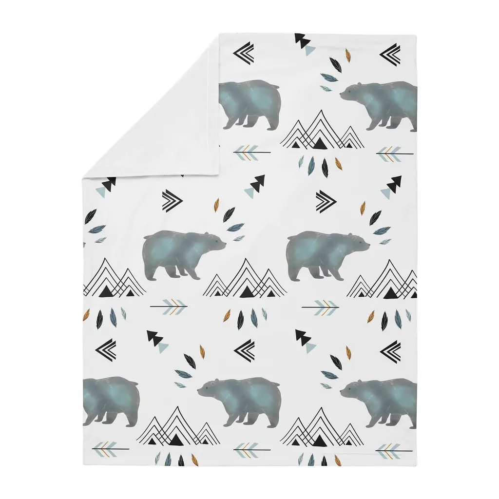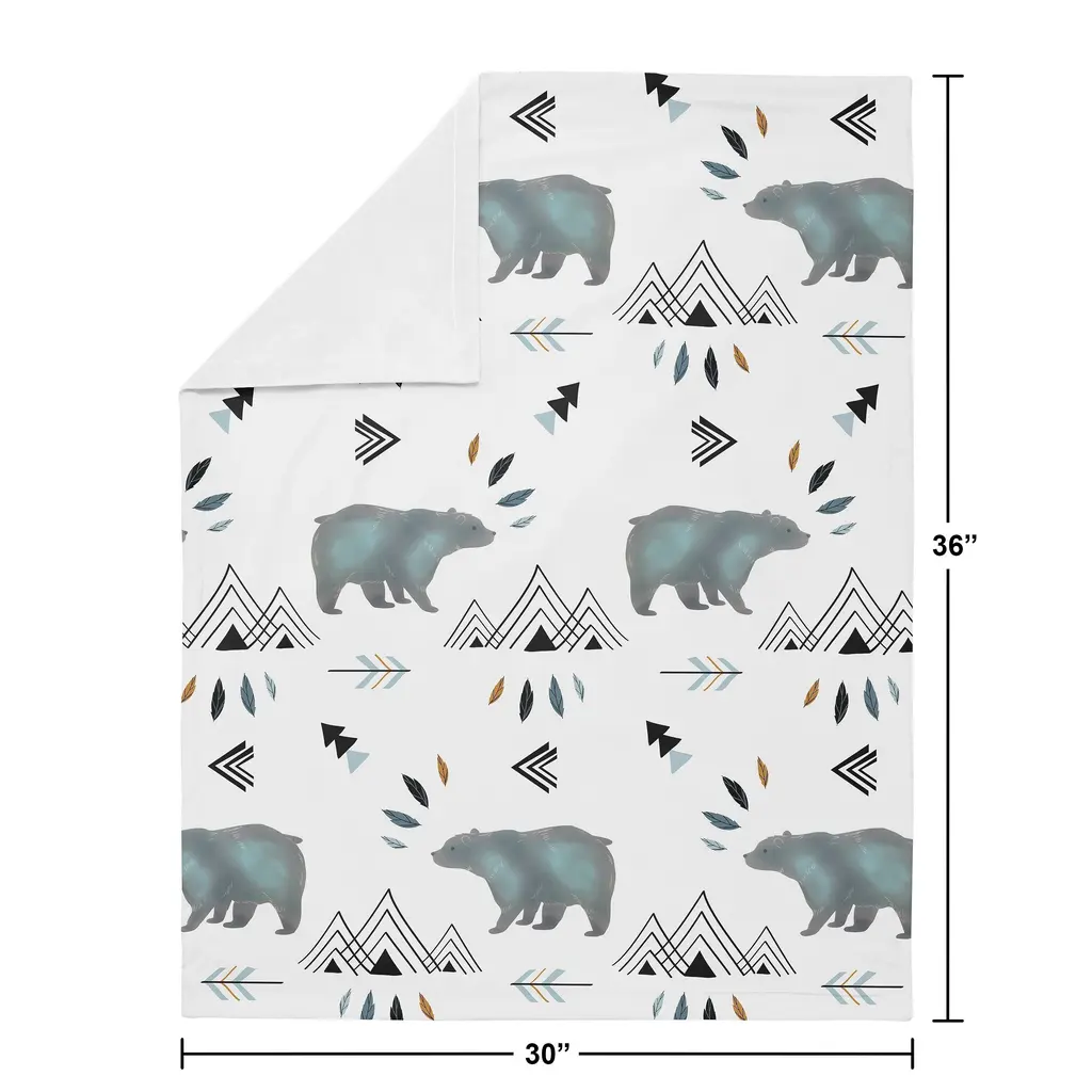 Sweet Jojo Designs baby blankets have an extremely soft feel that's perfect for newborns, infants and toddlers. Soft, snuggly and beautifully made, these blankets feature exclusive patterns and designs and can be used as a security blanket, receiving blanket, stroller cover, car seat cover, or tummy time floor blanket. These lightweight and easy on the go blankets are a must have for any parent or nursery and make the perfect baby shower gift. Don't forget to get an extra back up blanket so your little one can still have their "lovey" even when it needs to be washed. 30in. x 36in. Blanket is designed using a bear and mountain watercolor brushed microfiber print and reverses to soft white minky Lightweight blanket is small enough to toss in your bag but large enough to wrap your baby in love Machine wash cold, tumble dry low Coordinates with Sweet Jojo Designs nursery decor and accessories