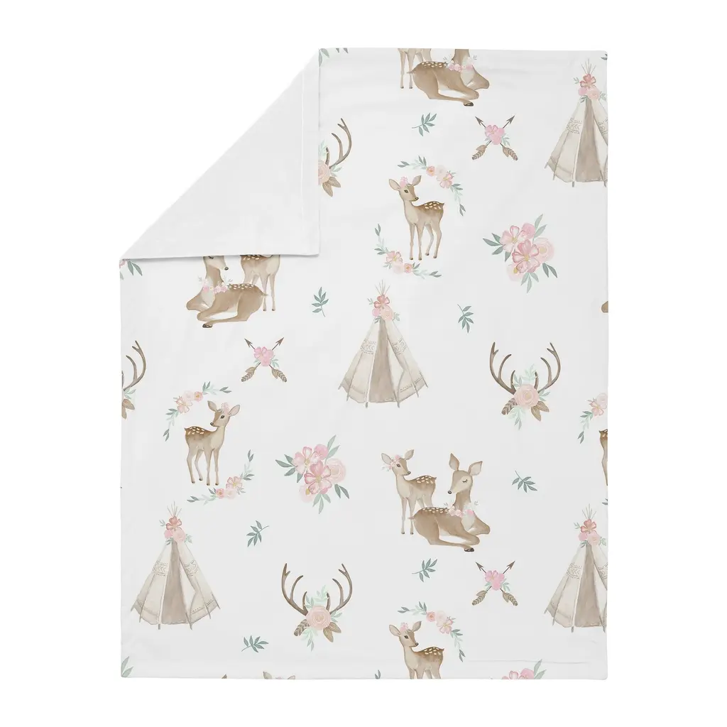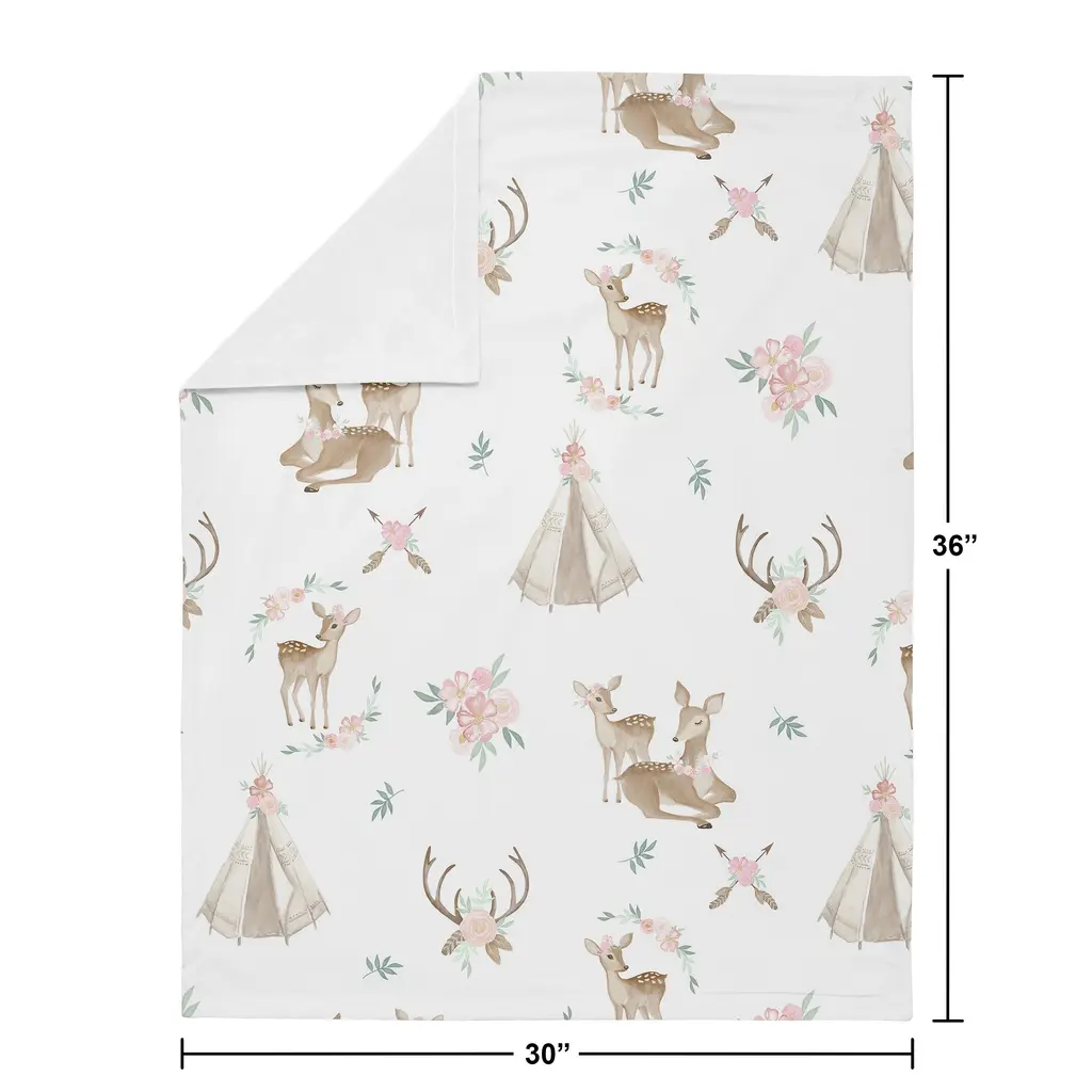 Sweet Jojo Designs Boho Watercolor Woodland Deer Floral Baby Receiving Security Swaddle Blanket - Blush Pink Mint Green White - Flowers/animals