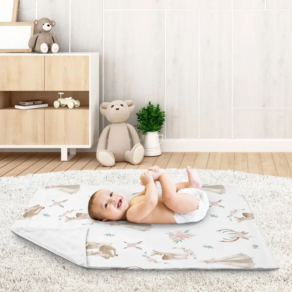 Sweet Jojo Designs baby blankets have an extremely soft feel that's perfect for newborns, infants and toddlers. Soft, snuggly and beautifully made, these blankets feature exclusive patterns and designs and can be used as a security blanket, receiving blanket, stroller cover, car seat cover, or tummy time floor blanket. These lightweight and easy on the go blankets are a must have for any parent or nursery and make the perfect baby shower gift. Don't forget to get an extra back up blanket so your little one can still have their "lovey" even when it needs to be washed. 30in. x 36in. Blanket is designed using a blush pink and mint green watercolor deer floral brushed microfiber print and reverses to soft white minky Lightweight blanket is small enough to toss in your bag but large enough to wrap your baby in love Machine wash cold, tumble dry low Coordinates with Sweet Jojo Designs nursery decor and accessories