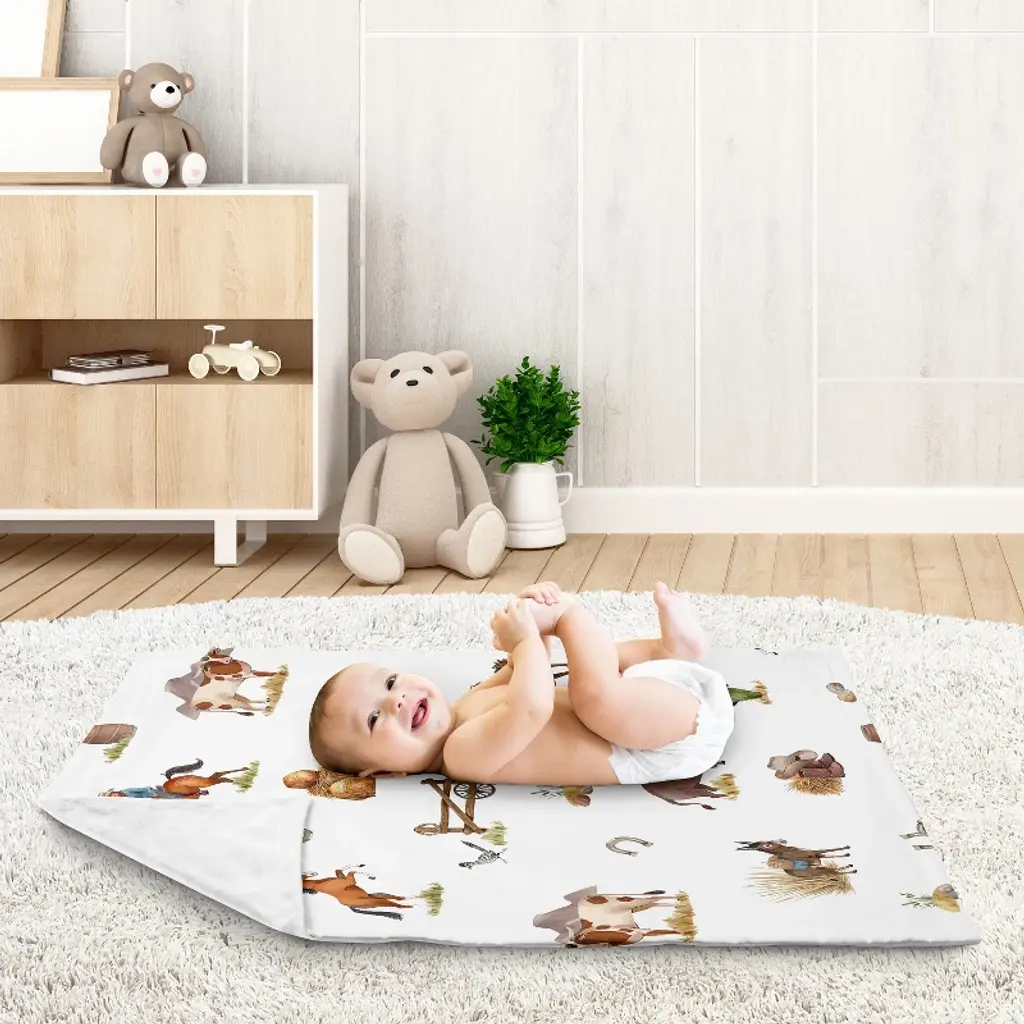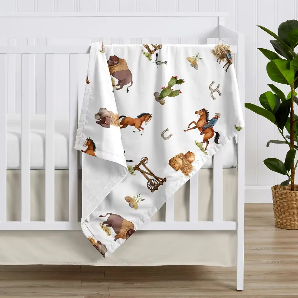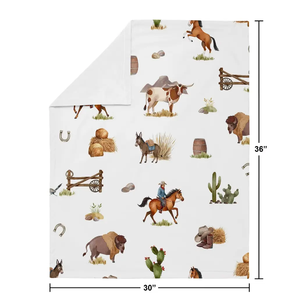 Country Western Collection Sweet Jojo Designs baby blankets have an extremely soft feel that's perfect for newborns, infants and toddlers. Soft, snuggly and beautifully made, these blankets can be used as a security blanket, receiving blanket, stroller cover, or tummy time floor blanket. These lightweight and easy on the go blankets are a must have for any parent or nursery and make the perfect baby shower gift. Don’t forget to get an extra back up blanket so your little one can still have their “lovey” even when it needs to be washed. Pair your blanket with your favorite Sweet Jojo Designs crib bedding sets, changing pad covers, crib sheets and other baby room decor accessories (These items not included). Blanket is designed using a taupe brown blue red white and tan western cowboy wild west southern charm country south horse steer farm animal desert cactus mountains sun print brushed microfiber and reverses to soft white minky