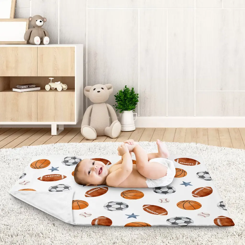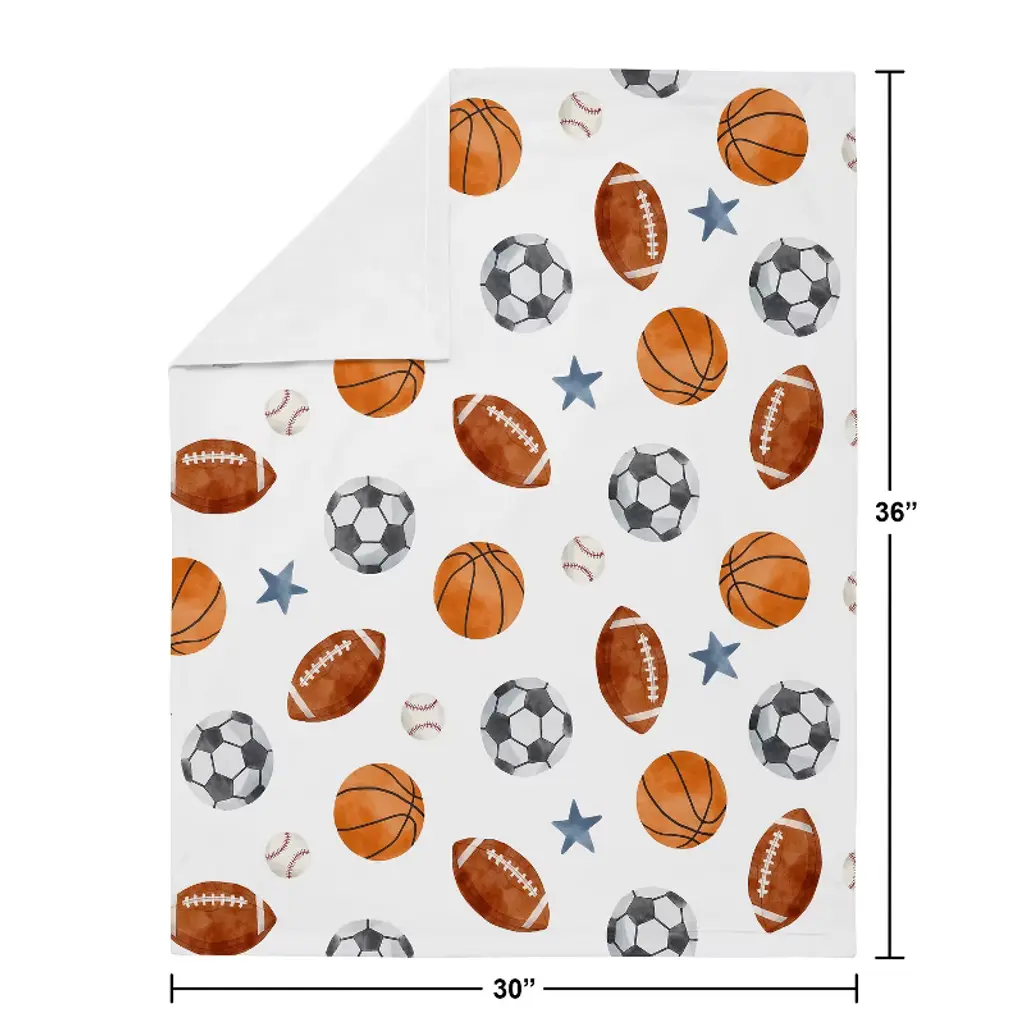 Watercolor Sports Theme Collection Sweet Jojo Designs baby blankets have an extremely soft feel that's perfect for newborns, infants and toddlers. Soft, snuggly and beautifully made, these blankets can be used as a security blanket, receiving blanket, stroller cover, or tummy time floor blanket. These lightweight and easy on the go blankets are a must have for any parent or nursery and make the perfect baby shower gift. Don’t forget to get an extra back up blanket so your little one can still have their “lovey” even when it needs to be washed. Pair your blanket with your favorite Sweet Jojo Designs crib bedding sets, changing pad covers, crib sheets and other baby room decor accessories (These items not included). Blanket is designed using a watercolor vintage sports theme soccer balls football baseball basketball blue stars sport theme brushed microfiber print and reverses to soft white minky